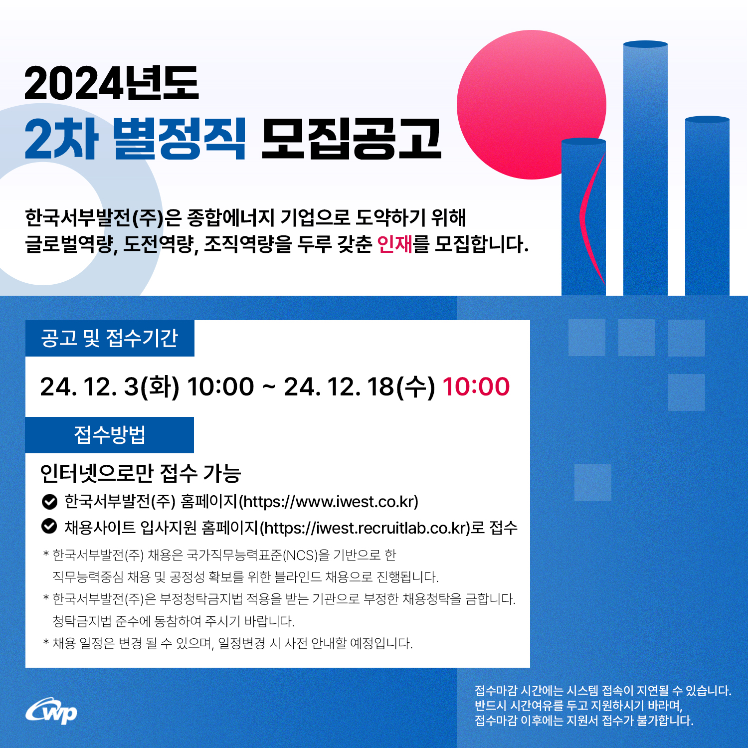 제목 [한국서부발전]2024년도 제2차 별정직 모집(~12/18)