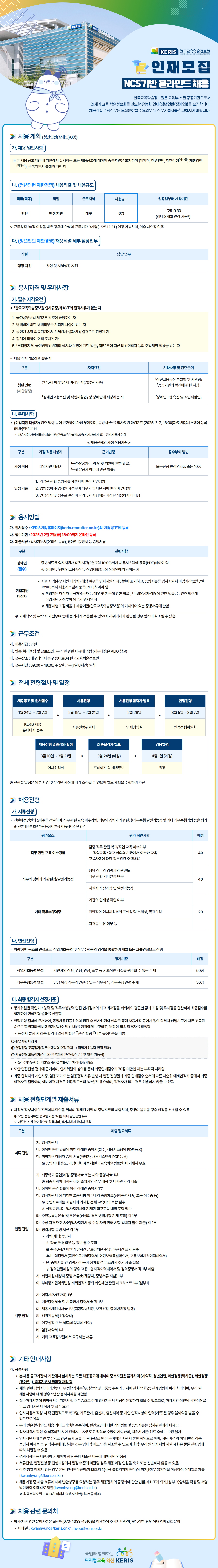 ▶채용 접수 사이트 주소: https://keris.recruiter.co.kr ▶접수기간: 2025. 1. 24.(금) ~ 2. 7.(금) 18:00 ▶채용지역: 계약직(대구 본원, 세종, 서울), 청년인턴(대구 본원) ▶채용분야: 계약직(대구 본원, 세종, 서울), 청년인턴(대구 본원) ▶기관 홈페이지: https://www.keris.or.kr