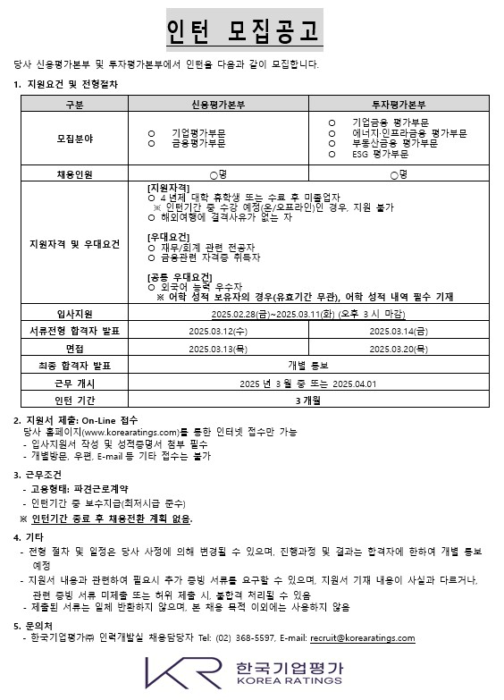 모집 부문 : 신용평가본부 및 투자평가본부 인턴