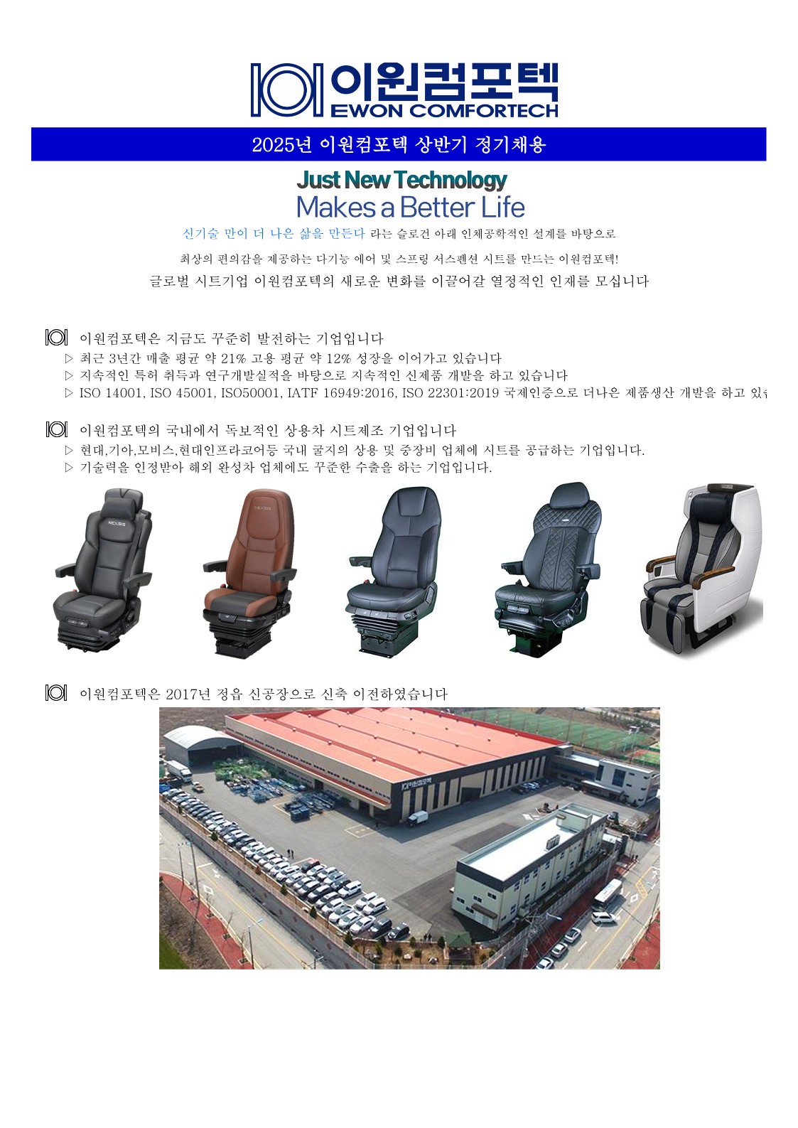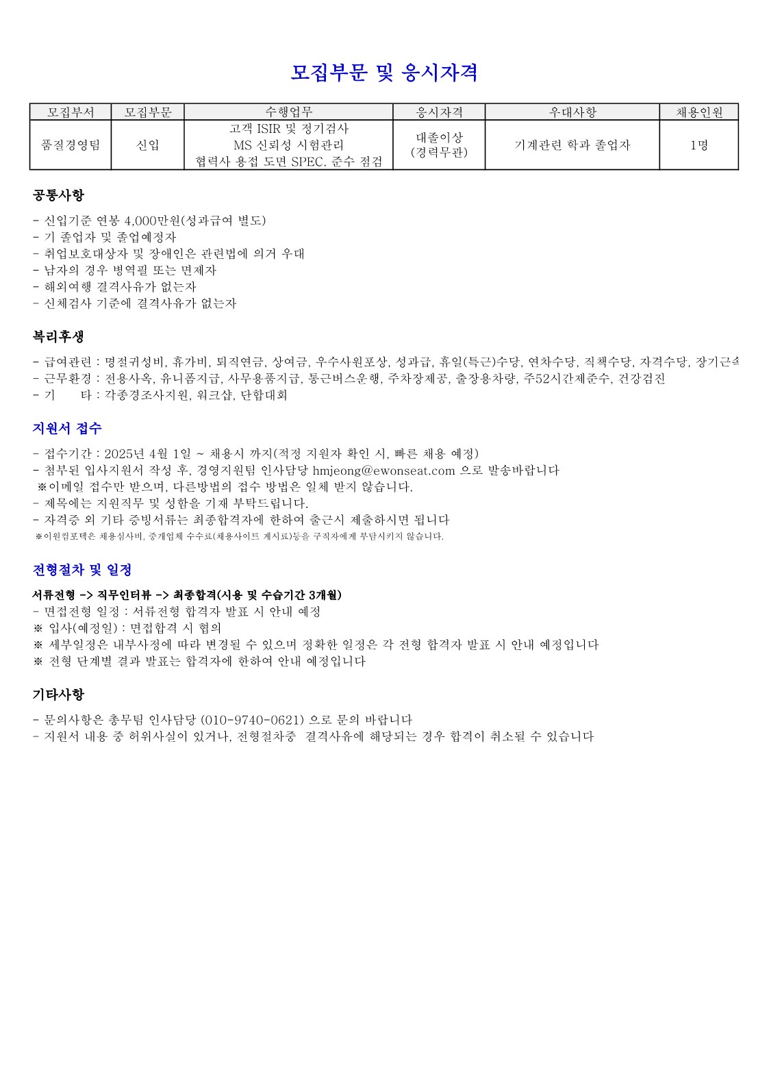 | 제목 | [이원컴포텍(주)]품질경영팀 신입 채용(채용시까지) | ||||