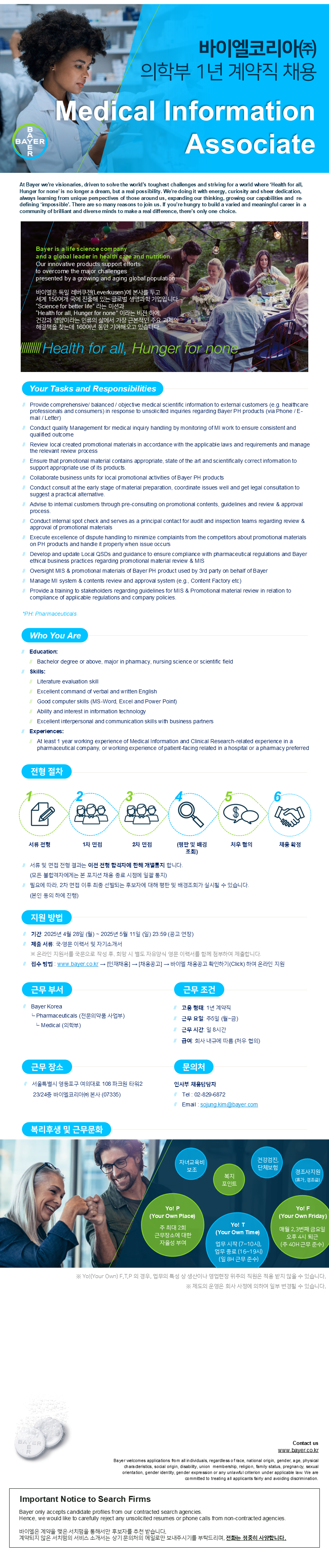 제목 [바이엘코리아]의학부 MSL, MIA 채용(마감일 상세확인)