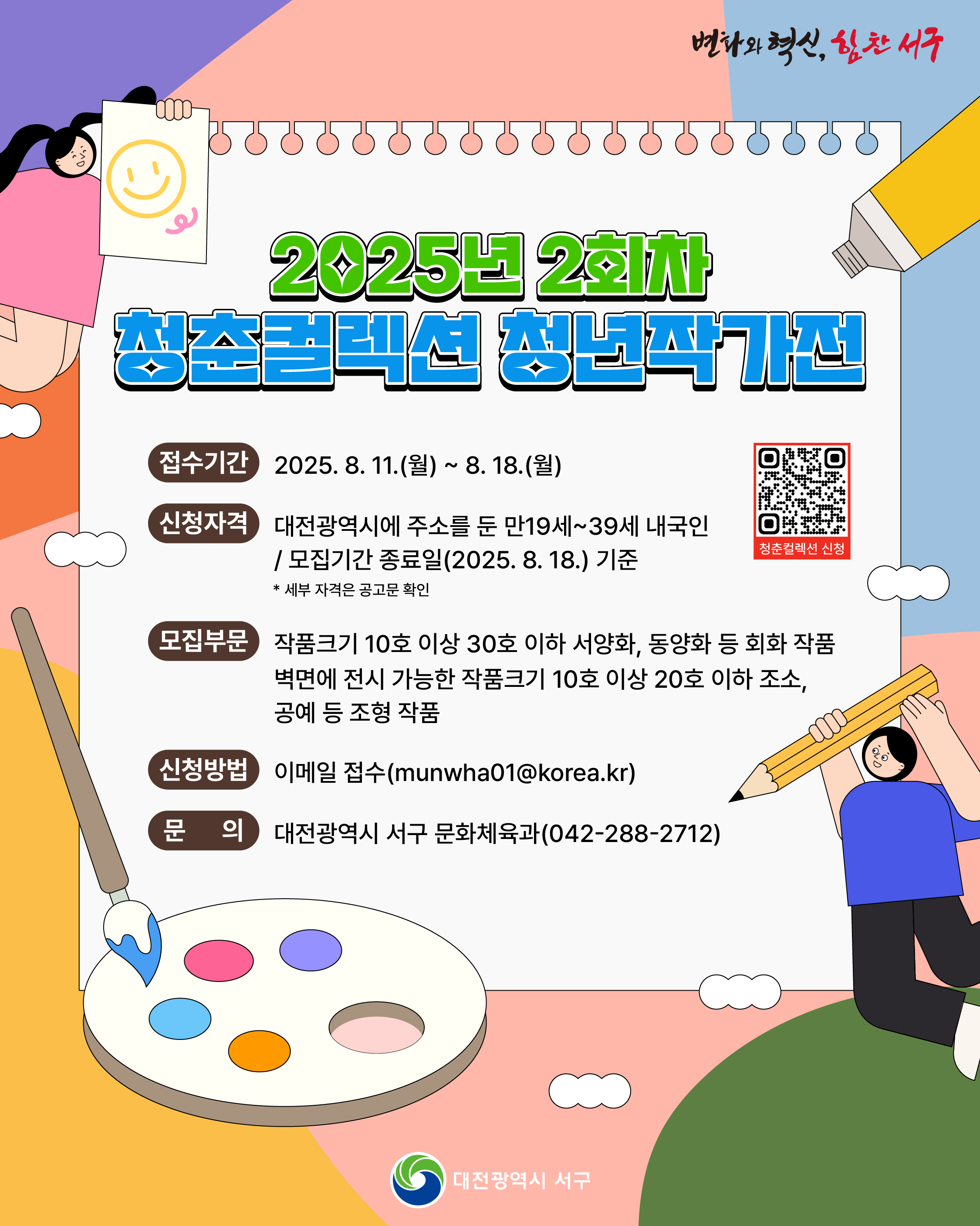 | 제목 | [대전광역시서구]2025년 2회차 청춘컬렉션 청년예술작가 모집(8/11~8/18)+ | ||||