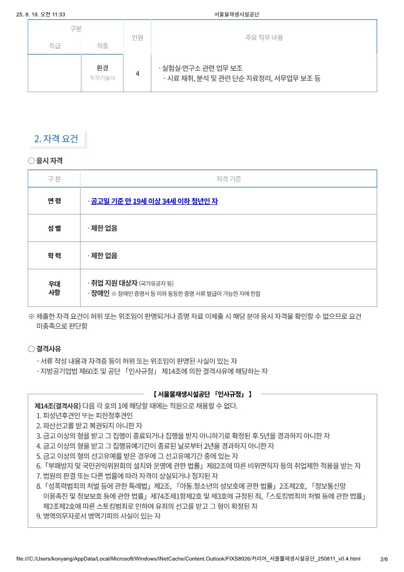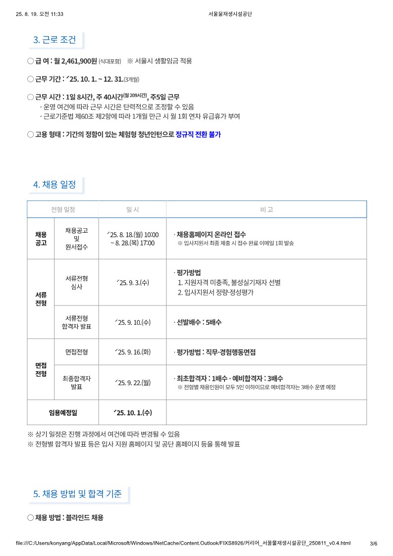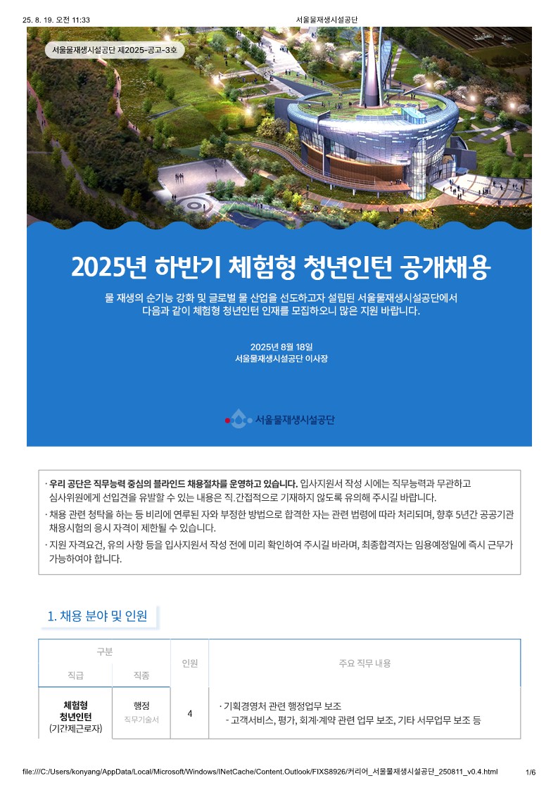 [서울물재생시설공단]2025년 하반기 체험형 청년인턴 공개채용(~8/28) 글의 상세내용
