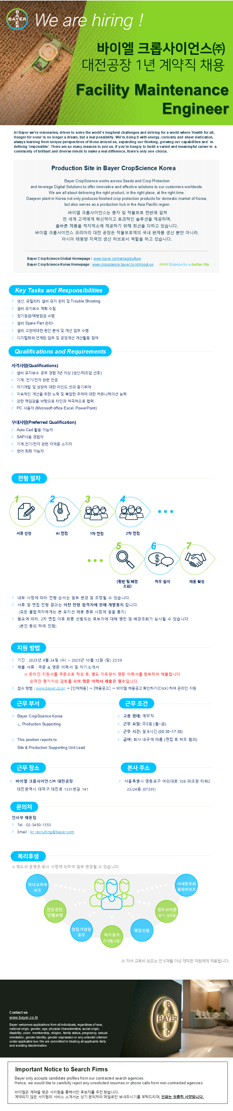 | 제목 | [바이엘크롭사이언스]GR Packing Line Operator, Facility Maintenance Engineer(~10/12) | ||||