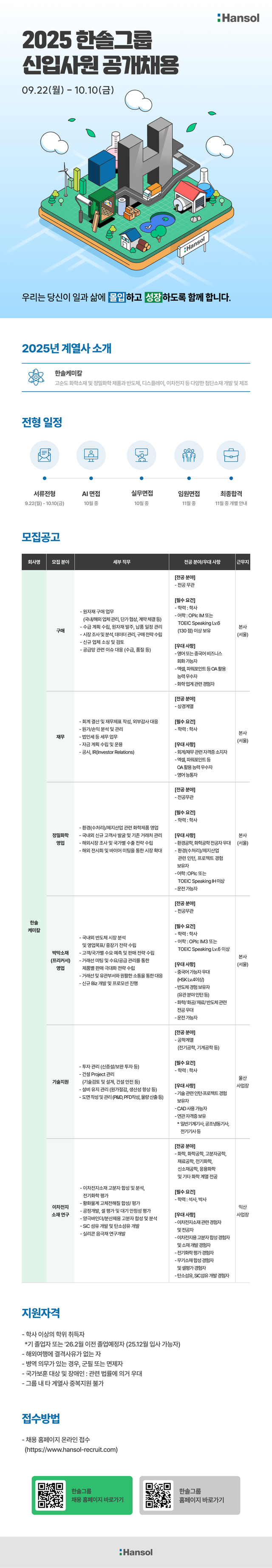 ◼︎ 접수방법 채용홈페이지 온라인 접수 (https://www.hansol-recruit.com)