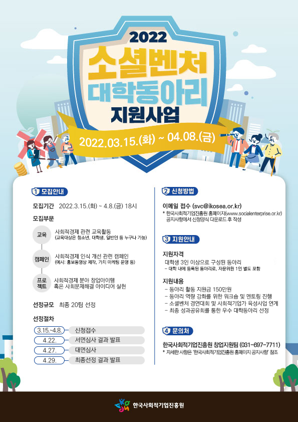 혁신적인 아이디어로 사회적가치를 추구하는 대학동아리를 발굴하고 소셜벤처 문화를 확산하기 위한 2022년 소셜벤처 대학동아리 지원 사업의 참여 동아리를 아래와 같이 모집하오니 많은 참여 바랍니다.