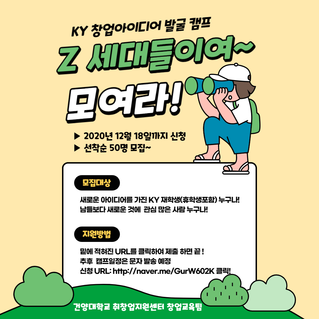 [KY 창업아이디어 발굴 캠프 사전 수요조사] 취창업지원센터 창업교육팀에서는 새로운 아이디어를 가진 재학생들을 위하여 창업아이디어 발굴 캠프를 진행하고자 사전 수요조사를 진행하고 있습니다. 본교 재학생분들의 많은 참여부탁드립니다. 아래 신청하기를 부담없이 클릭! 클릭! 해주세요...