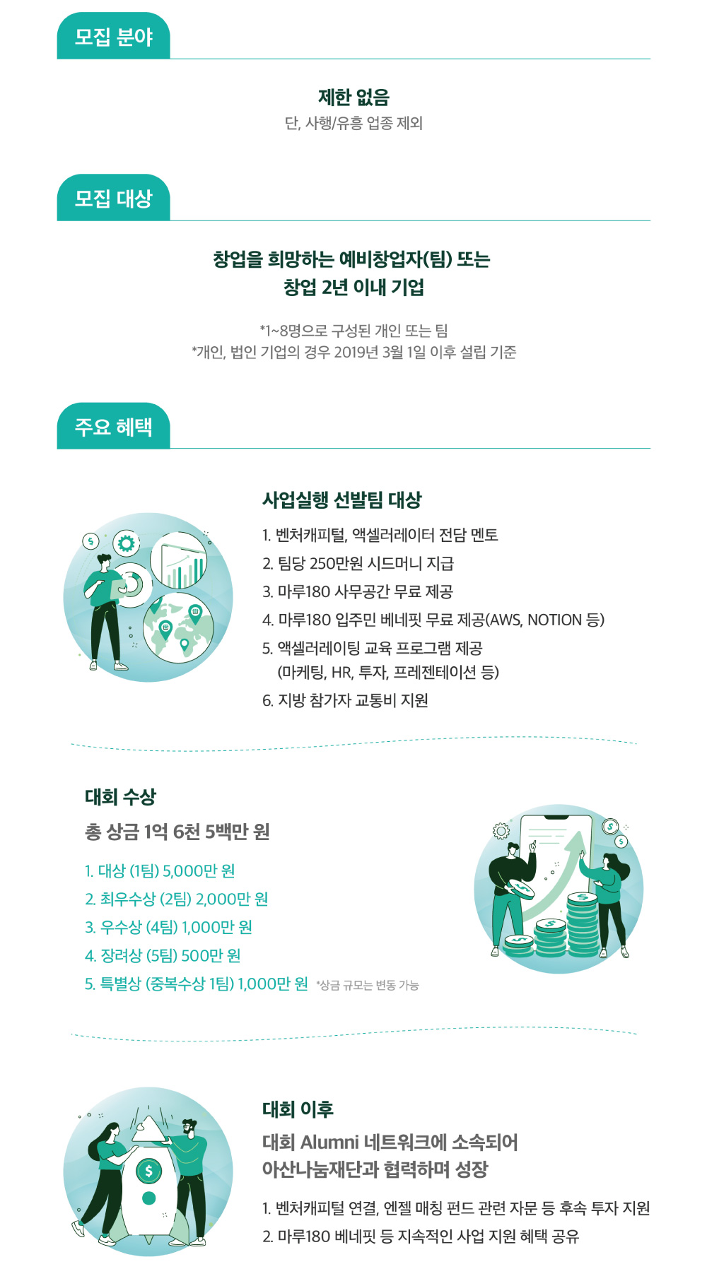 대상 5,000만원 등 총상금 1억 6천 500만원 규모로 진행되는 본 대회는 전국의 유망 창업자를 발굴하여 시드머니, 업무공간, 멘토링, 네트워킹 기회 제공을 통해 창업의 첫걸음을 지원합니다. 관심있는 여러분들의 많은 참여 바랍니다