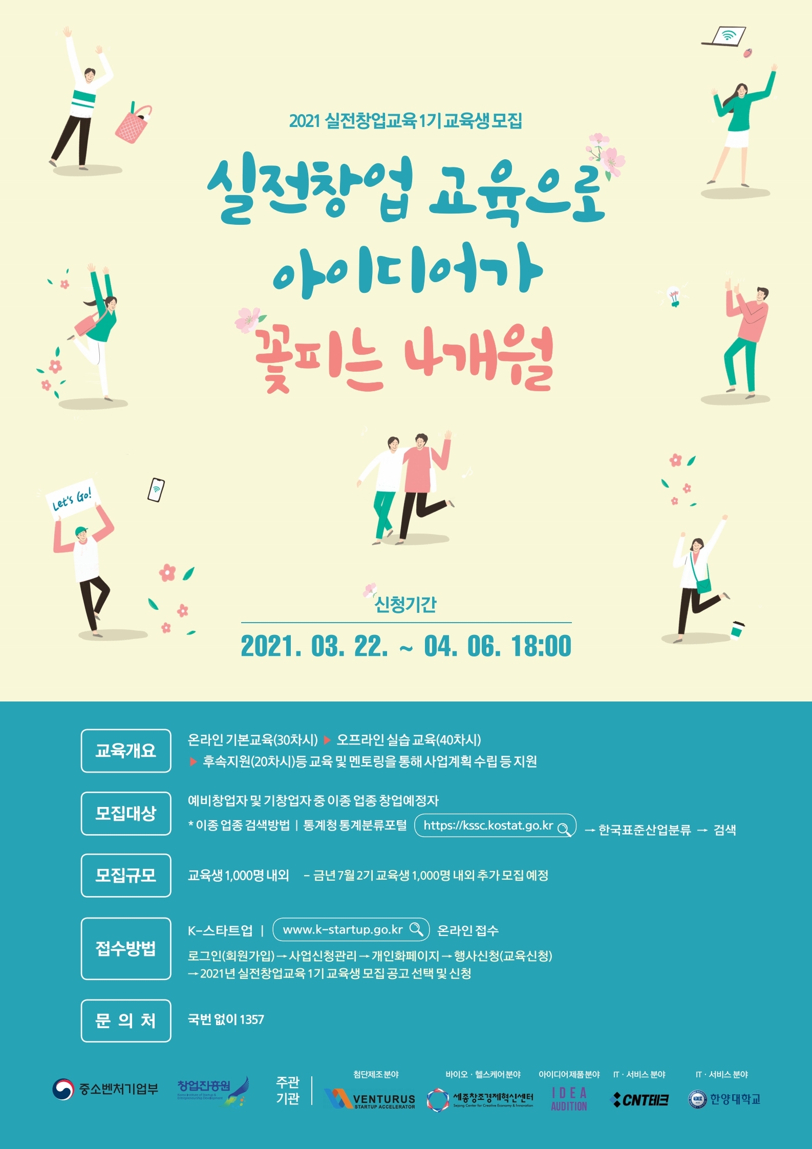 중소벤처기업부와 창업진흥원에서 주관하는 2021 실전창업교육1기 교육생모집 공고안내 입니다