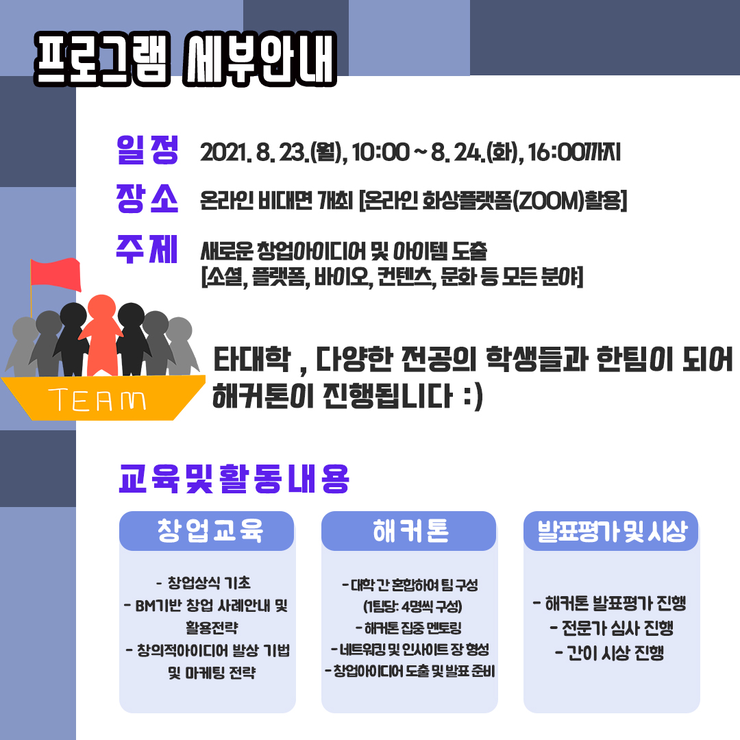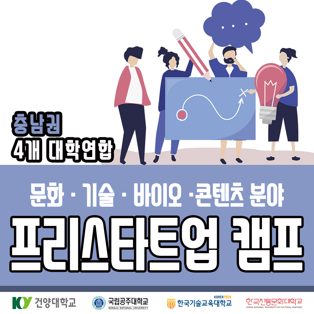 8월 23일과 24일 충남권 4개 대학연합 창업캠프가 진행됩니다 관심있는 여러분의 많은 신청 바랍니다 가. 프로그램 : 충남권 4개 대학연합「문화‧기술‧바이오‧콘텐츠」 프리스타트업 캠프 나. 운영기간 : 2021.08.23.(월) ~ 08.24(화), 1박 2일 다. 운영방법 : 실시간 비대면(Zoom프로그램)으로 진행 라. 운영대상 : 총 40명 참여 (참여 4개교 재학생 각 10명) 마. 운영내용 : 충청권 4개교(건양대, 공주대, 한국기술교육대, 한국전통문화대)