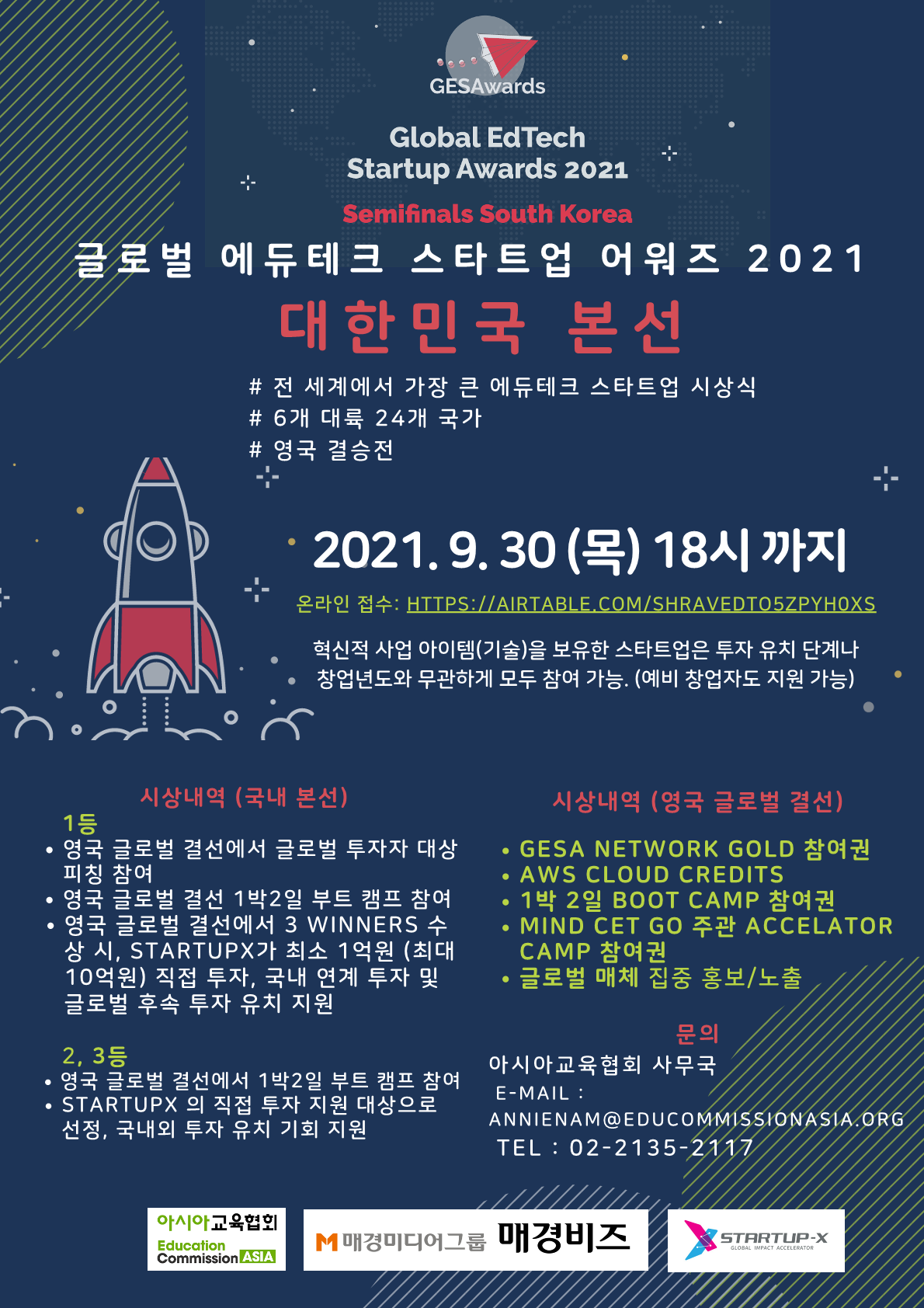 GESAwards는 전 세계에서 가장 큰 에듀테크 스타트업 시상식으로, 6개 대륙 24개 국가에서 예선전이 치러지며 매년 1월 영국 Bett쇼에서 결승이 이뤄집니다. 교육 시장의 이슈를 명확히 다루고 혁신적인 교육학적 비즈니스 모델을 다루는 우수한 에듀테크 스타트업들을 선정하는 대회입니다. 국내 본선 (Semi-final)에서 1,2,3등을 뽑아 다양한 수상 혜택과 투자 유치 기회 뿐더러 영국 결선에 참여하는 항공권도 제공됩니다. 또한 참가자들은 글로벌 기업들과 함께 협업하고 수상을 할수 있는 Special Track들도 같이 지원하실 수 있습니다. ★ 지원 자격 : 혁신적 사업 아이템(기술)을 보유한 스타트업은 투자 유치 단계나 창업년도와 무관하게 모두 참여 가능(예비 창업자도 지원 가능) ★ 접수 기간 : 2021.6.29(화) ~ 2021.9.30(목) 18시 까지 ★ 접수 방법 : 온라인 접수 https://airtable.com/shraVEDto5zpyh0xS(한국어 번역 양식 첨부파일의 [붙임1] 참고) ★ 자세한 내용 : 첨부파일의 [붙임2] 참고 ★ 문의 - 아시아교육협회 사무국 (E-mail : annienam@educommissionasia.org TEL : 02-2135-2117) - 카카오톡 오픈채팅: https://open.kakao.com/o/gSrZ7fXc (문의 답변 가능 시간 : 평일 오전 10시-오후 5시)