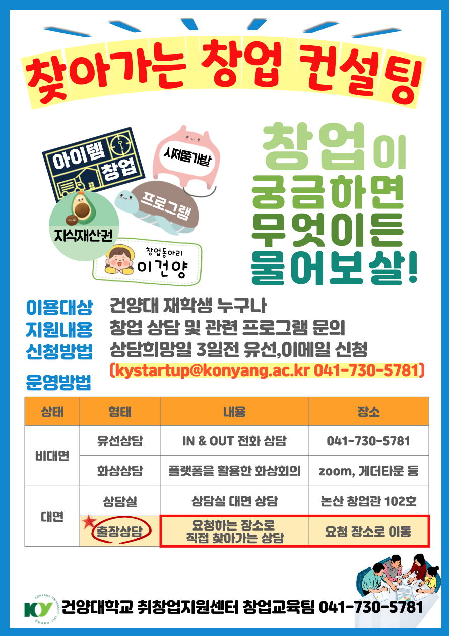 안녕하세요? 창업에 관해 궁금하신 점이나 도움이 필요하시면 언제든지 신청해주세요~ 유선, 화상, 상담실, 출장상담 모두 가능합니다 ^^ 궁금하신 사항은 창업교육팀 ☎ 041-730-5781으로 연락주세요!