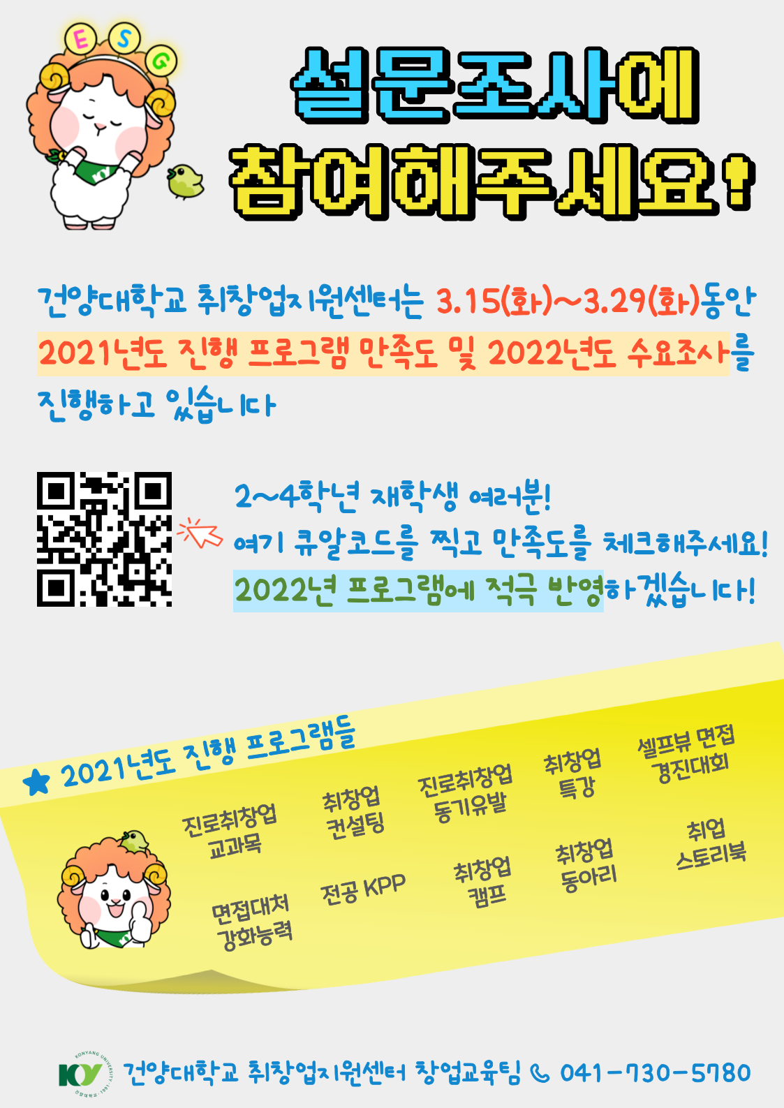 1. 조사기간 : 2022. 3. 15(화) ~ 3. 29(화) 2. 조사분야 : 진로·취업·창업 지원프로그램 만족도 및 수요조사 3. 조사대상 : 재학생 2~4학년(※신입생 제외) 4. 조사방법 : 온라인 설문( 바로가기 http://naver.me/5axdqVof ) |