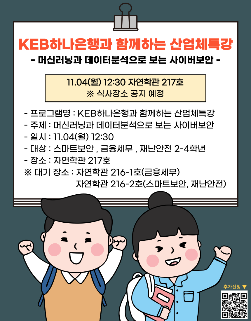 가. 프로그램명 : KEB하나은행과 함께하는 산업체특강 나. 주제 : 머신러닝과 데이터분석으로 보는 사이버보안 다. 유형 : 특강 및 멘토링 라. 일시 : 11.04(월) 12:30 마. 대상 : 스마트보안학과, 금융세무학부, 재난안전소방학과 바. 장소 : 자연학관 217호 ※ 대기 장소 : 학생별 개별 안내 문자 발송 예정