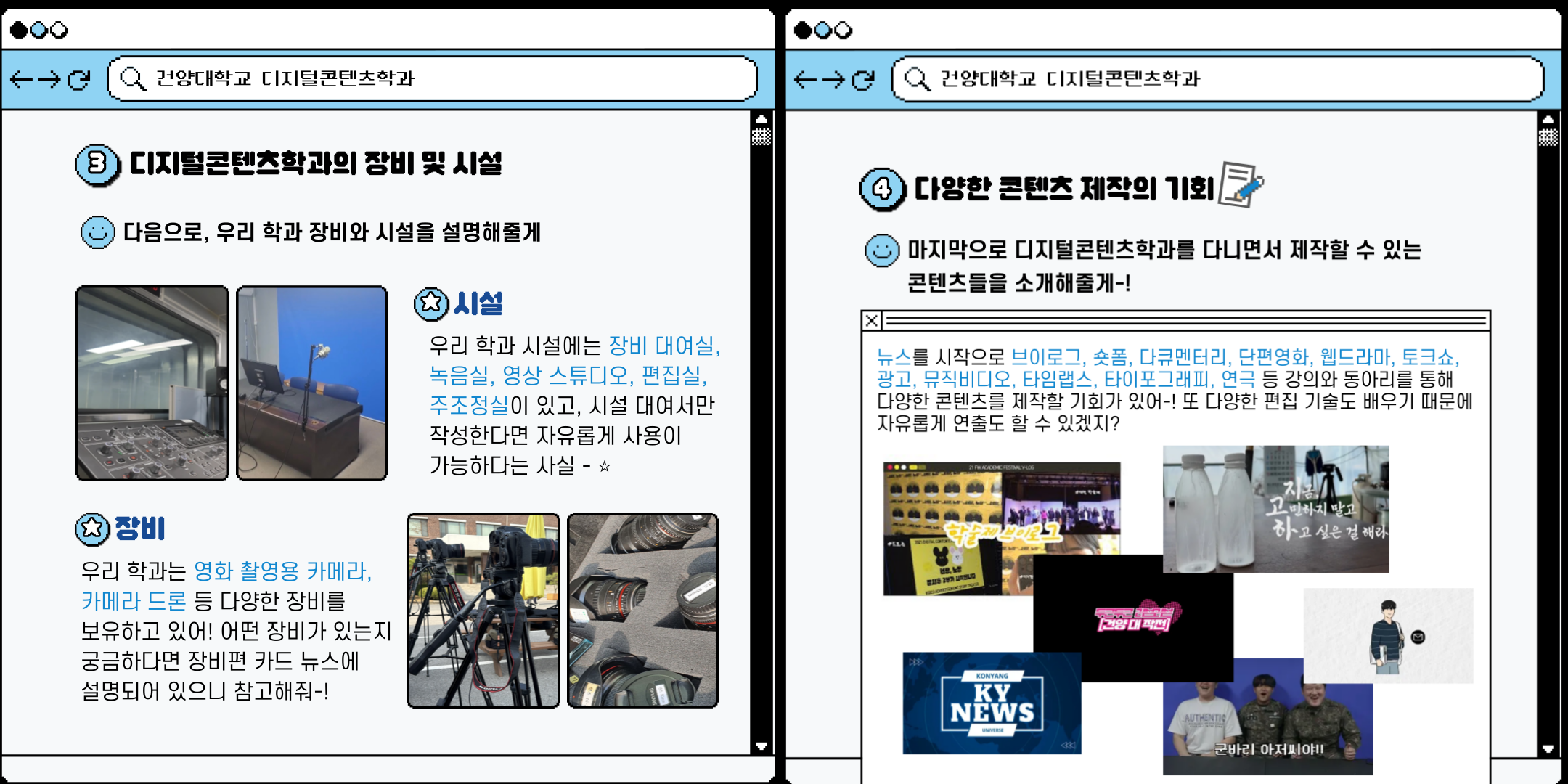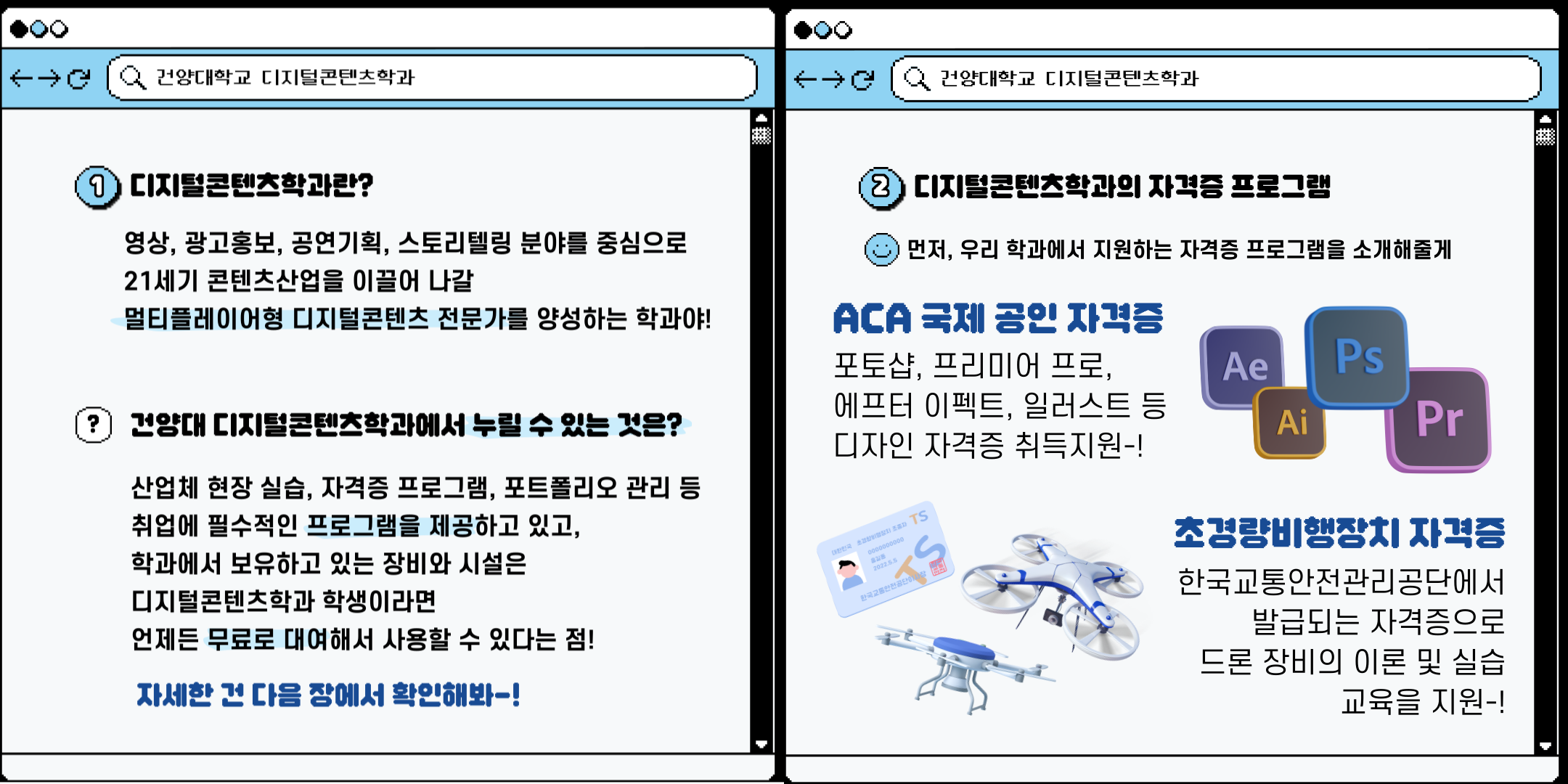 안녕하세요! 디지털콘텐츠학과 건양메이트입니다! 입시생 여러분들께 조금이나 도움이 되고자 디지털콘텐츠학과에 대한 카드뉴스를 만들었습니다. 카드뉴스 참고해주시고, 많은 관심부탁드립니다. 감사합니다-! |