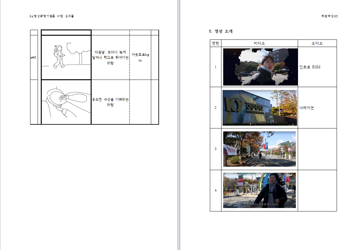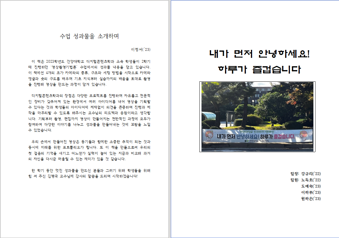 디지디지털콘텐츠학과 현 2학년 학생들은 지난 학기에 진행된 ‘영상촬영기법론(담당: 김병국 교수)’ 과목에서 자신들이 활동한 결과물을 ‘『성장, 나를 위한 한걸음』’란 이름으로 제작했다. 학생들은 이 수업을 통해 카메라의 세팅 방법, 다양한 기능, 카메라 배치법뿐만 아니라 카메라의 구도 잡는 법, 카메라의 시점과 움직임 그리고 그 의미들에 대한 기본 지식과 실무를 익혔다. 또한 팀 활동을 통해 카메라의 다양한 효과들에 대해 자료를 조사하고 발표하는 활동도 하였다. 이 성과물은 학생들이 과제로 제시된 영상물을 만드는 과정, 즉 ‘기획의도, 시놉시스, 시나리오, 콘티, 영상물’을 담았고, 그리고 이 활동을 하면서 학생들이 느낀 경험도 함께 실었으니, ‘내가 먼저 안녕하세요! 하루가 즐겁습니다, 결자해지: 나의 소원은!, 보이지 않는 칼, 하람극장’ 등이다 |