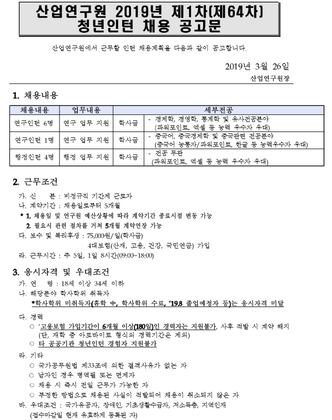 | 제목 | (~4/9)산업연구원 2019년 제1차 청년인턴 채용 공고 안내 | ||||