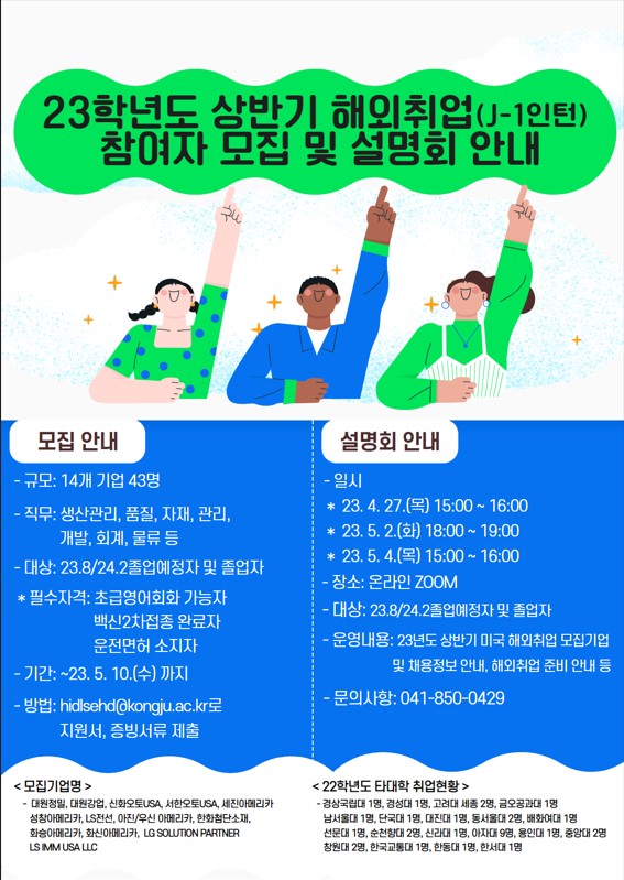 가. 해외취업(J-1) 모집개요 - 규모: 14개 기업* 43명 * 대원정밀아메리카, 대원강업아메리카, 신화AUTO USA, 서한AUTO USA, 세진 아메리카, 성창아메리카, LS전선, 아진/우신아메리카, 한화첨단소재 화승아메리카, 화신아메리카, LG SOLUTION PARTNER, LS IMM USA LLC - 직무: 생산관리, 품질, 자재, 개발, 회계, 물류 등 - 필수조건: 초급영어회화 가능자, 백신2차접종 완료자, 운전면허 소지자 - 모집기간: ~ ′23. 5. 10.(수) 18:00 까지 - 신청방법: 지원서 및 증빙서류 작성하여 hidlsehd@kongju.ac.kr로 제출 나. 설명회 개요 - 주요내용