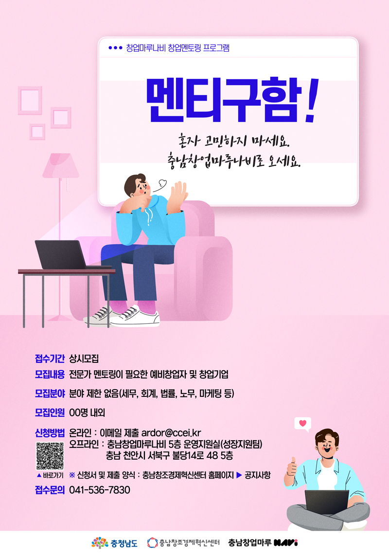 [충남창업마루나비 창업멘토링 프로그램] ❍ 사 업 명: 창업멘토링 프로그램(창업멘토단) 운영 ❍ 공고기간: 상시모집 ❍ 접수기간: 상시모집 ❍ 모집대상: 전문가 멘토링이 필요한 예비창업자 및 창업기업 ❍ 신청방법: 온라인 / 오프라인 제출 ※ 온 라 인 제출: 이메일(ardor@ccei.kr) ※ 오프라인 제출: 충남창업마루나비 5층 운영지원실(성장지원팀) (충남 천안시 서북구 불당14로 48 5층)