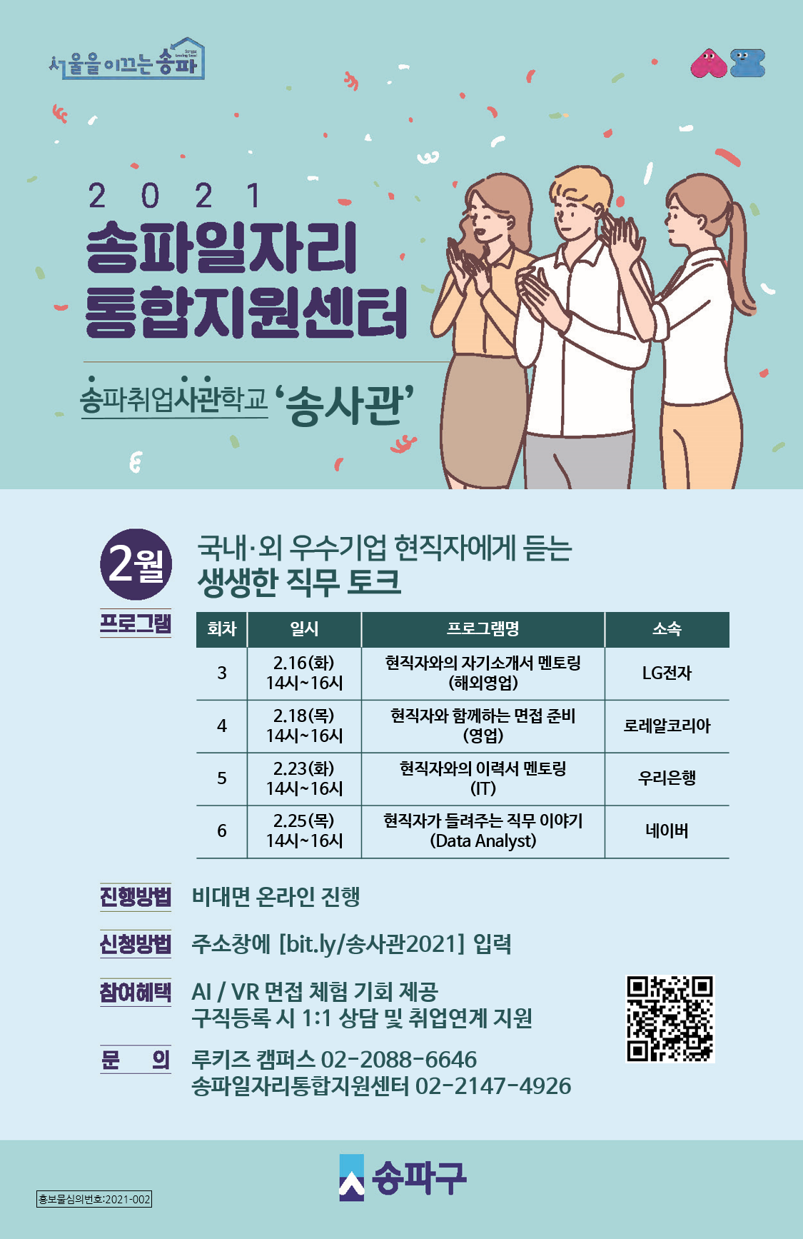[송사관 2월 취업교육 프로그램] 청년 구직자 취업지원 프로그램「송파취업사관학교 ‘송사관’」참여자를 모집하고 있습니다. 사전 신청을 통해 비대면 온라인으로 진행하고 있으니 많은 관심 바랍니다. 감사합니다. - 문의 : 송파 일자리통합지원센터 02)2147-4926