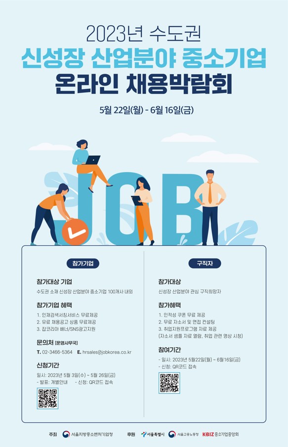 가. 행사명칭 : 2023 수도권 신성장 산업분야 중소기업 온라인 채용박람회 나. 사업기간 : 2023.5.22(월) ~ 6.16(금) 다. 사 이 트 : 잡코리아 온라인 채용관 1) 주소 : https://www.jobkorea.co.kr/Theme/mss 라. 참여기업 : 신성장 산업분야 중소기업(지능형 ICT, 의료·바이오 등) 마. 대 상 자 : 청년 구직자(대학 졸업자 또는 예정자) 등