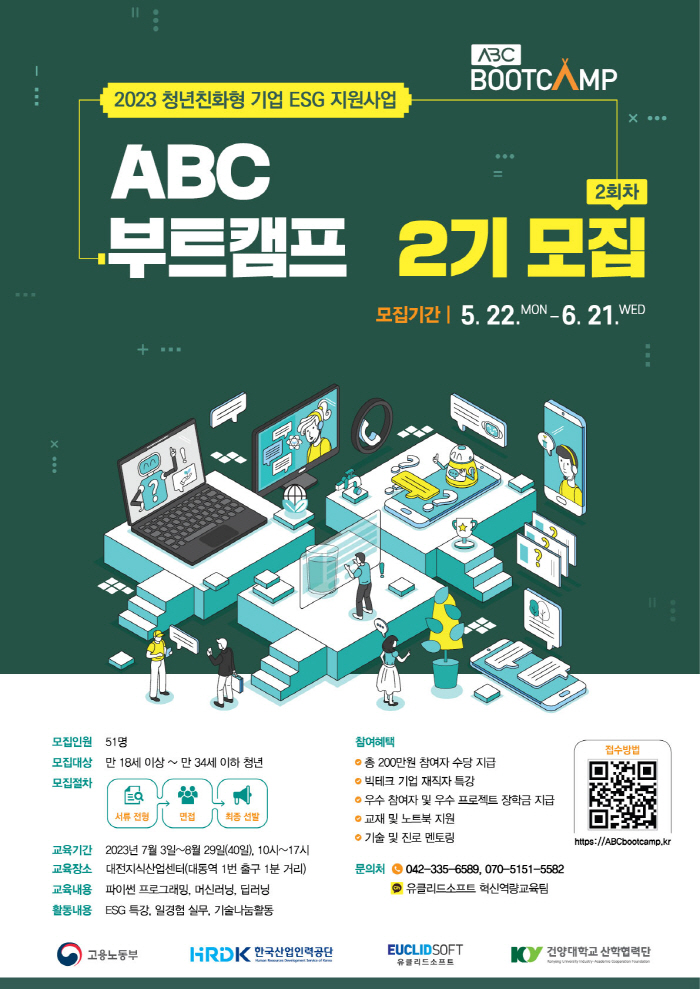 가. 사업명: 23년도 청년친화형 기업 ESG 지원사업 나. 부처/전담: 고용노동부/한국산업인력공단 다. 운영기관: (주)유클리드소프트 라. 프로그램명: ABC 부트캠프 마. 모집기간: 2023년 5월 22일 ~ 6월 21일 바. 모집인원: 51명 사. 모집대상: 만 18세 이상 ~ 만 34세 이하 청년(전공불문) 아. 모집절차: 서류 전형 -> 면접 -> 최종 선발 자. 교육기간: 2023년 7월 3일 ~ 8월 29일(40일), 평일 10시 ~ 17시 차. 교육장소: 대전지식산업센터(대동역 1번 출구 1분 거리) 카. 교육방식: 대면교육 타. 교육내용: 파이썬 프로그래밍, 데이터 시각화, 머신러닝, 딥러닝 파. 활동내용: ESG 특강, 일경험 실무, 기술나눔활동 등 하. 참여혜택: 1) 총 200만원 참여자 수당 지급 2) 빅테크 기업 재직자 특강 3) 우수 참여자 및 우수 프로젝트 장학금 지급 4) 교재 및 노트북 지원 5) 기술 및 진로 멘토링 6) 수료증 발급 7) 월별 우수 참여자 인센티브 제공 8) 웰컴 부스터 굿즈 제공 등 거. 신청접수 및 상세내용 확인: https://www.abcbootcamp.kr 너. 문의사항: (주)유클리드소프트 혁신역량교육팀 1) 카카오채널: http://pf.kakao.com/_pDpyb 2) 유선전화: 042-335-6589, 070-5151-5582
