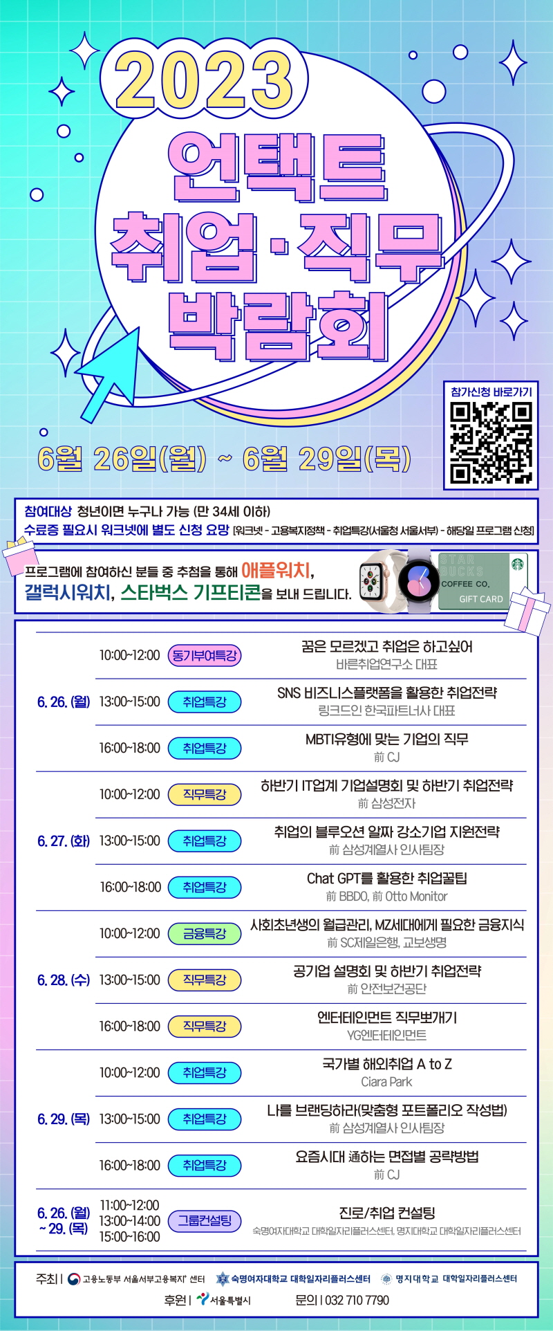 가. 프로그램명: 2023 언택트 취업·직무박람회(3회차) 나. 일시: 2023.06.26(월)~29(목) 10:00~18:00 다. 대상: 만 34세 이하 청년 라. 운영방법: 비대면 실시간 플랫폼(ZOOM) 운영 마. 내용: 취업/직무/동기부여특강 및 금융특강, 진로/취업 그룹컨설팅 (세부내용 포스터 참고) 바. 신청: https://forms.gle/ZZ2nBahaWLEP6UxK7 사. 기타사항 1) 수료증 필요 시 워크넷을 통해 별도 신청 요망 (수료증은 국민취업지원제도 구직활동 증빙자료로 제출 가능) 2) 프로그램 참여자 중 추첨을 통하여 애플워치, 갤럭시워치, 커피쿠폰 등 지급