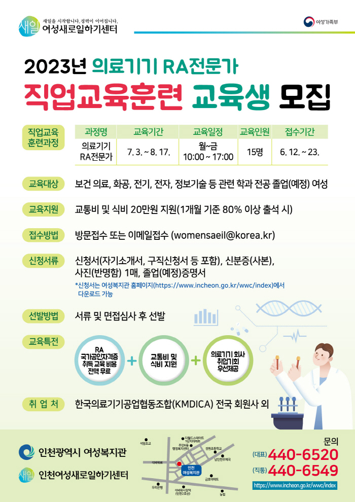 | 제목 | [인천광역시여성복지관] 2023년 인천새일센터 직업교육훈련 「의료기기 전문가 과정」교육생 모집 | ||||