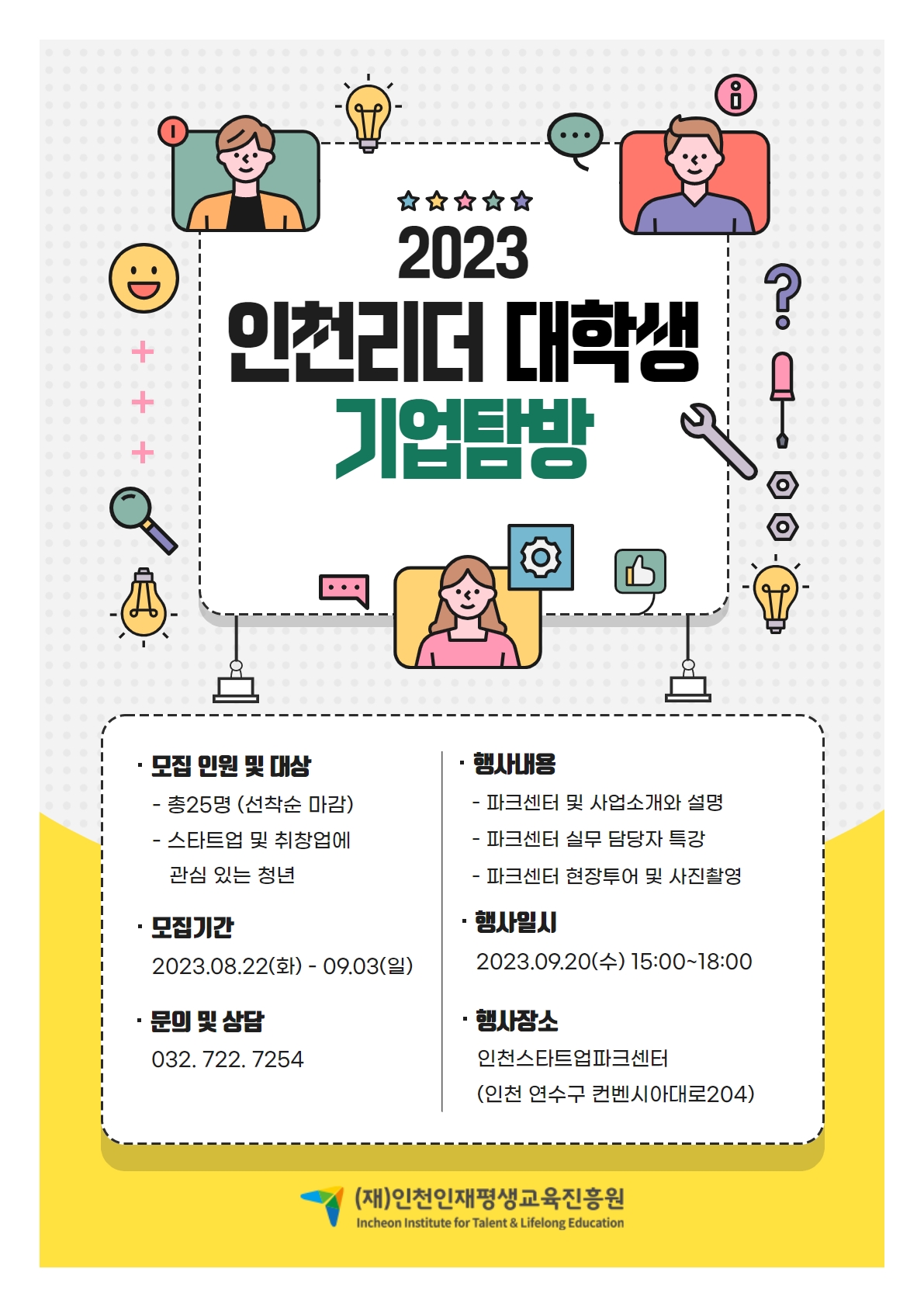 가. 행 사 명: 인천리더 대학생 기업탐방 나. 일 시: 2023. 9. 20.(수) 15:00 ~ 18:00 다. 장 소: 인천스타트업파크센터(인천 연수구 송도동 소재) 라. 참석대상: 청년 50여명 마. 주요내용: 스타트업파크센터 및 사업소개, 스타트업 관련 강의, 시설 견학 등 바. 신청방법: 9.3(일)까지 구글폼 온라인 선착순 접수 (https://forms.gle/pQ9svC2BjydRUk8C9) 사. 문 의: 인천인재평생교육진흥원 장학사업부(☎032-722-7254)