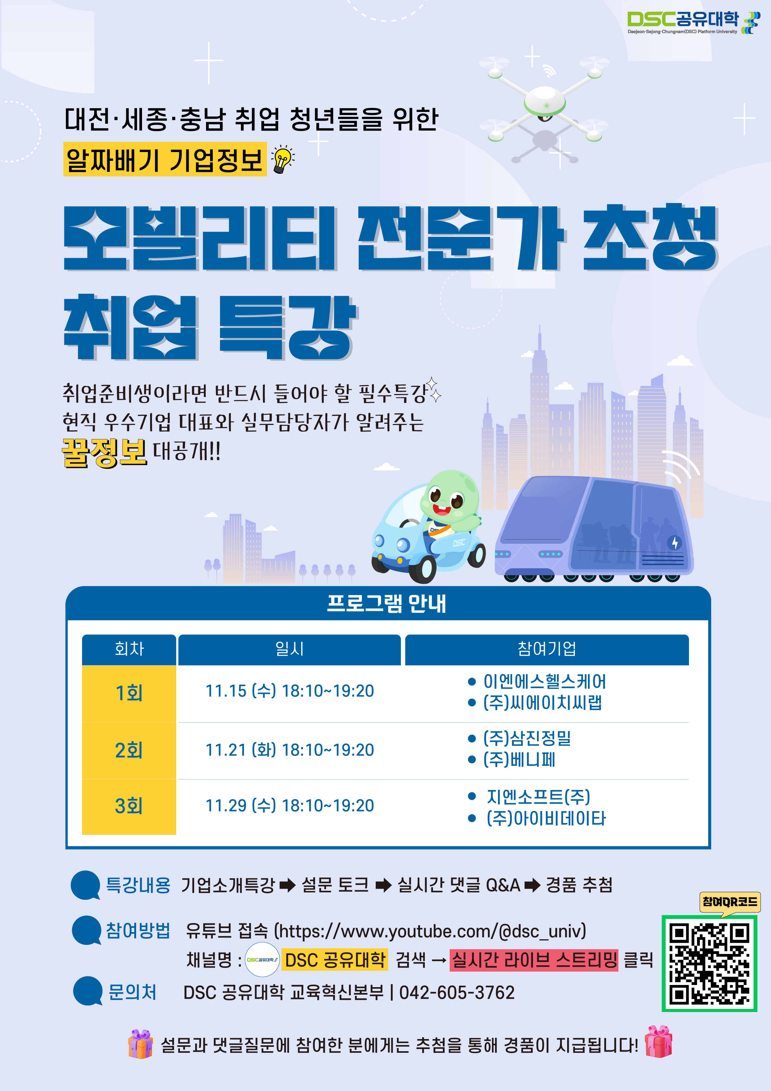 가. 사 업 명: DSC 공유대학「모빌리티 전문가 초청 취업 특강」 나. 참여대상: DSC 공유대학 24개 참여대학 소속 재학생 다. 운영형태: 온라인 및 오프라인 특강(실시간 퀴즈 및 설문조사 진행) 라. 참여방법: https://youtu.be/PbUt9avmk4o (모바일, PC 접속 가능) ※오프라인 참여는 DSC 공유대학 ‘충청기업론’수강생만 가능 마. 특강내용: 대전·세종·충남소재 기업체 현직자를 초청하여 현장에서 필요한 직무역량, 인재상 등 생생한 진로·취업정보를 실시간으로 공유하는 진로·취업 이야기 바. 특강일정 및 내용