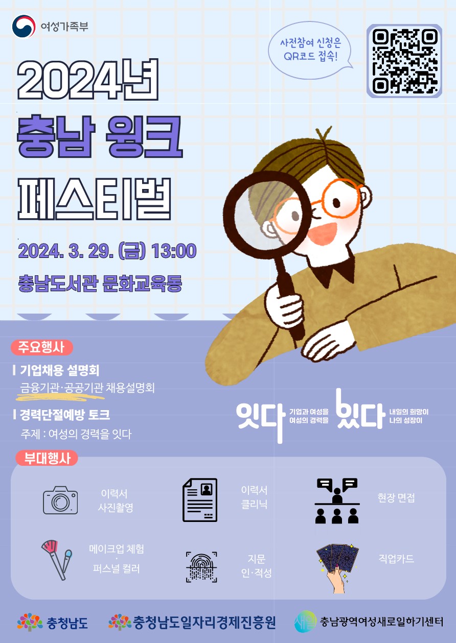 가. 주 제 : 기업과 여성을 잇다. 내일의 희망이 있다. 나. 일 시 : 2024. 3. 29.(금) 13:00 ~ 16:00 다. 장 소 : 충남도서관 문화동(홍성군 홍북읍 도청대로 577) 라. 주관주최 : 충청남도, (재)충청남도일자리경제진흥원 마. 참석대상 : 도민‧기업, 특성화고, 대학교, 유관기관 등 바. 주요내용 : 금융기관‧공공기관 채용설명회, 경력단절 예방 토크, 체험‧채용부스 등