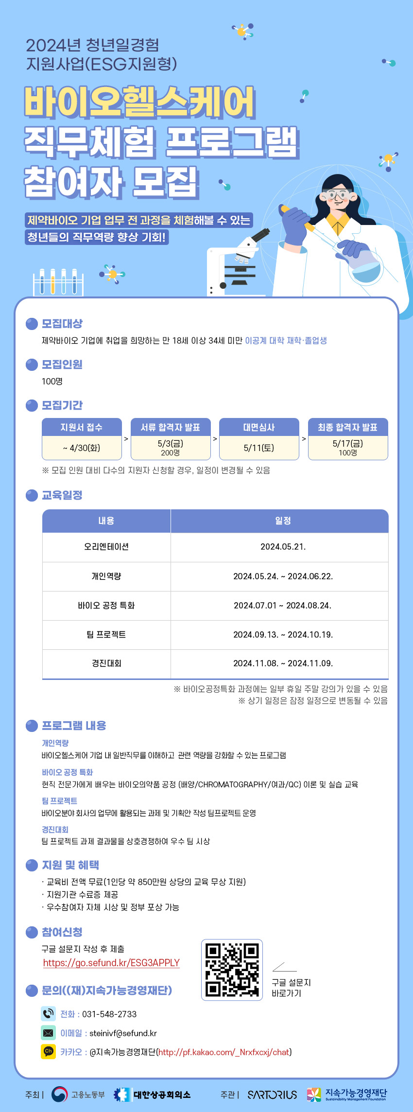 가. 프로그램명 : 바이오헬스케어 직무체험 프로그램 나. 모집대상 : 제약바이오 기업에 취업을 희망하는 만 18세 이상 34세 미만 이공계 대학 재학·졸업생 다. 모집기간 : 2024년 4월 3일(수) ~ 2024년 4월 30일(화) 라. 프로그램 운영기간 : 2024년 5월 21일(화) ~ 2024년 11월 9일(토) 마. 선발절차 : 서류 합격자 발표 (5월 3일 예정) → 대면심사(5월 11일) →최종 합격자 발표 (5월 17일 예정) 바. 선발인원 : 100명 사. 주최/주관 : 고용노동부, 대한상공회의소 / 싸토리우스코리아바이오텍(유), (재)지속가능경영재단 아. 참여신청 : https://go.sefund.kr/ESG3APPLY 자. 문의사항 : (재)지속가능경영재단 (031-548-2733, steinivf@sefund.kr)