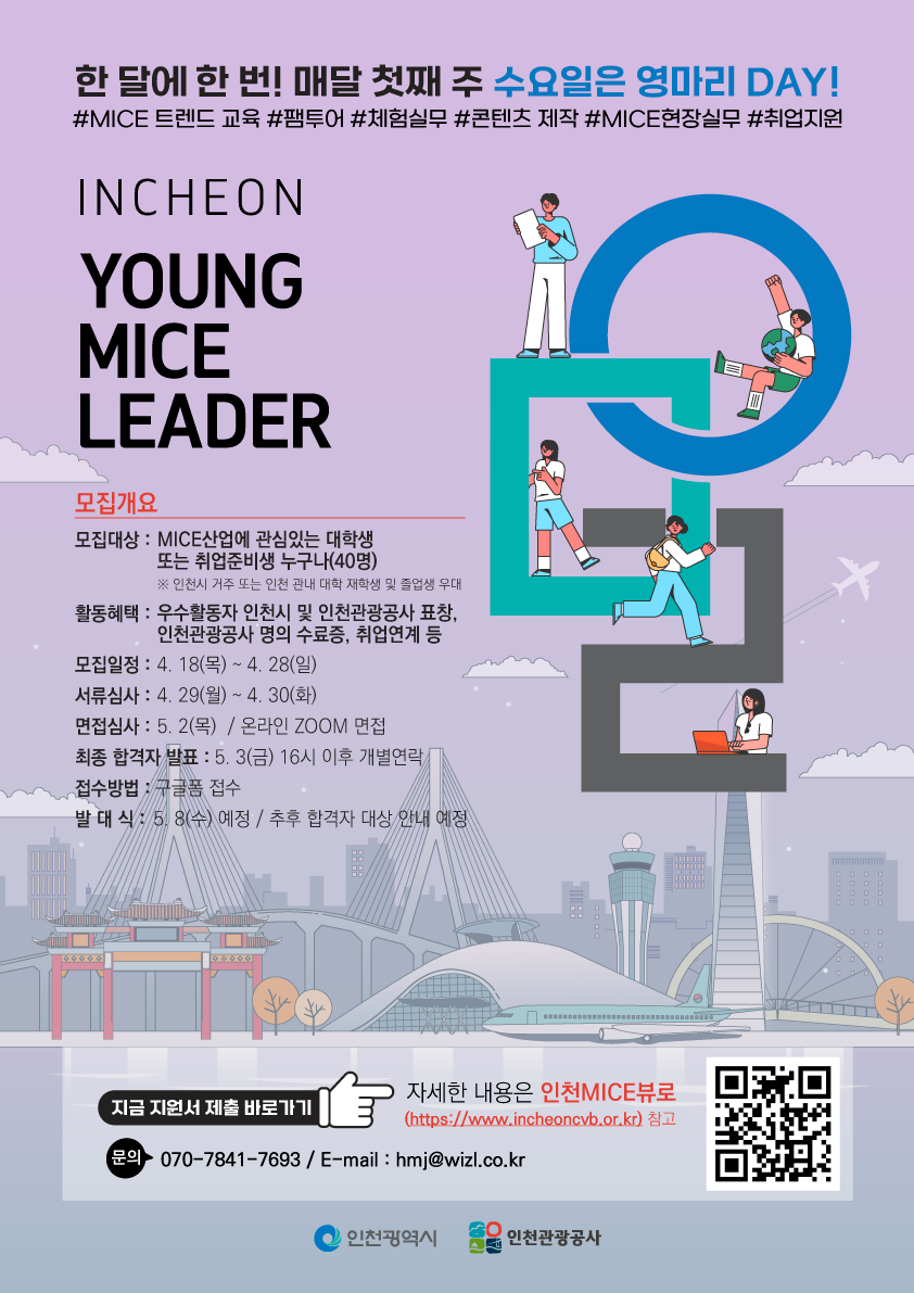 1) 모집대상 - MICE에 관심있는 대학생 및 취업준비생 40명 *인천 거주 또는 인천소재 대학생 및 휴학생 우대 - 인천에서 개최되는 MICE 행사에 오프라인 참가 가능한 자 2) 활동기간 : 2024. 5월 ~ 11월 3) 활동내용 : MICE 트렌드 교육, 유니크베뉴 답사, 행사 현장실무 참가, 콘텐츠 제작 등 4) 활동혜택 : 우수활동자 인천시 및 인천관광공사 표창, 수료증 지급, MICE 취업연계 등 5) 지원방법 : 구글폼 작성(https://url.kr/pihgr6) * 자세한 내용은 인천MICE뷰로 홈페이지 내 ‘인천 YOUNG MICE 리더’탭에서 확인가능(www.incheoncvb.or.kr) 나. 모집일정 1) 서류접수 : 2024. 4. 18.(목) ~ 4. 28.(일), 11일간 2) 서류심사 : 2024. 4. 29.(월) ~ 4. 30.(화) 3) 면접심사 : 2024. 5. 2.(목) / 온라인 zoom 면접 4) 합격발표 : 2024. 5. 3.(금) 16시 이후 개별 연락 *발대식 : 2024. 5. 8.(수) 개최예정