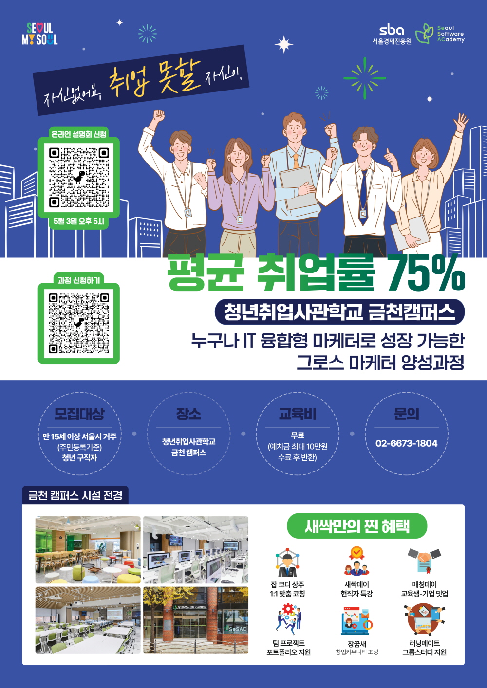| 제목 | 서울시 청년취업사관학교 새싹(SeSAC) 금천캠퍼스 교육생 모집 온라인 설명회(그로스마케팅 분야) | ||||