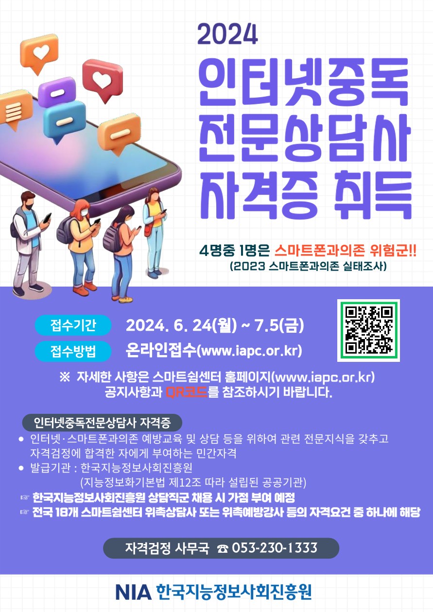 | 제목 | 2024년도 제11회 인터넷중독전문상담사 자격검정 시행(6/24~7/5) | ||||