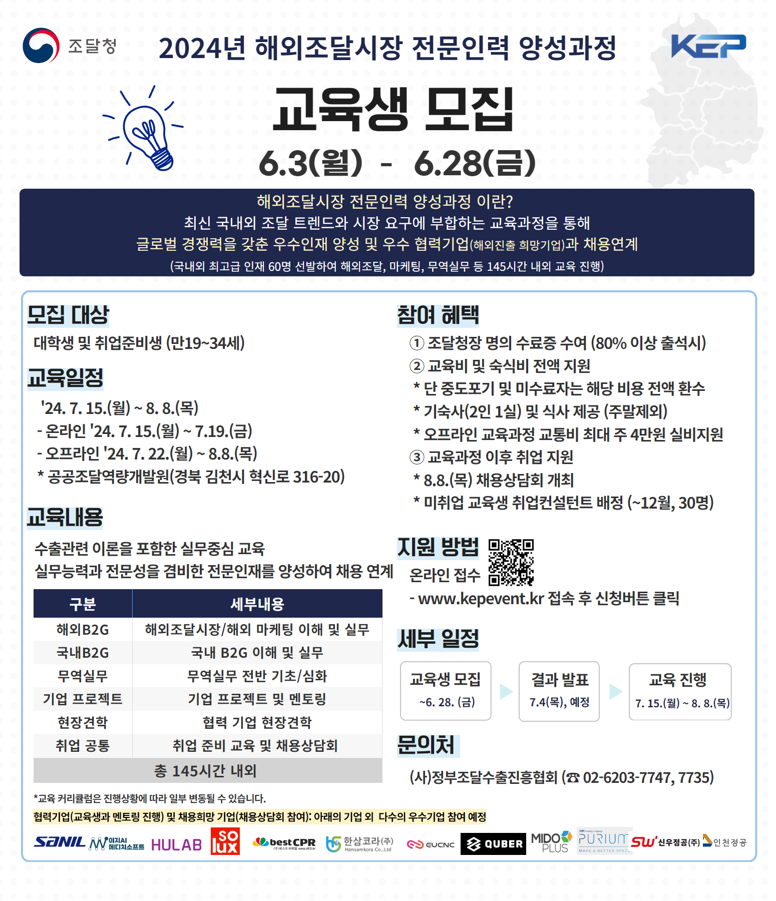 | 제목 | [조달청]'2024년 해외조달시장 전문인력 양성과정' 교육생 모집 | ||||