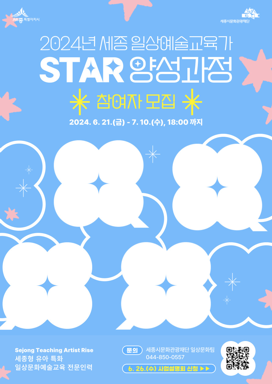 | 제목 | [세종시문화관광재단] 「2024년 세종 일상예술교육가(STAR) 양성과정」참여자 모집 | ||||