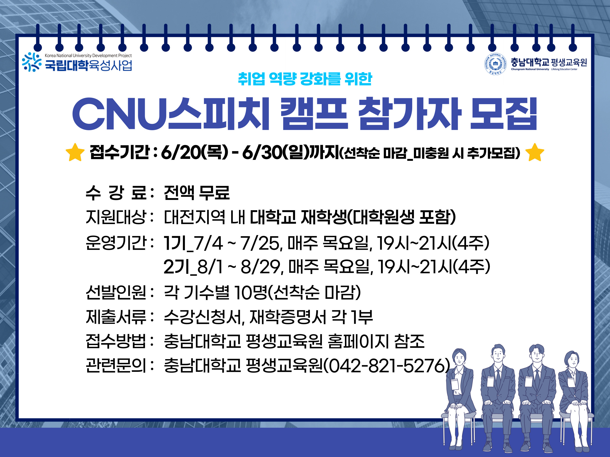 | 제목 | 충남대학교 평생교육원 「CNU 스피치 캠프」 무료강좌 수강생 모집 | ||||