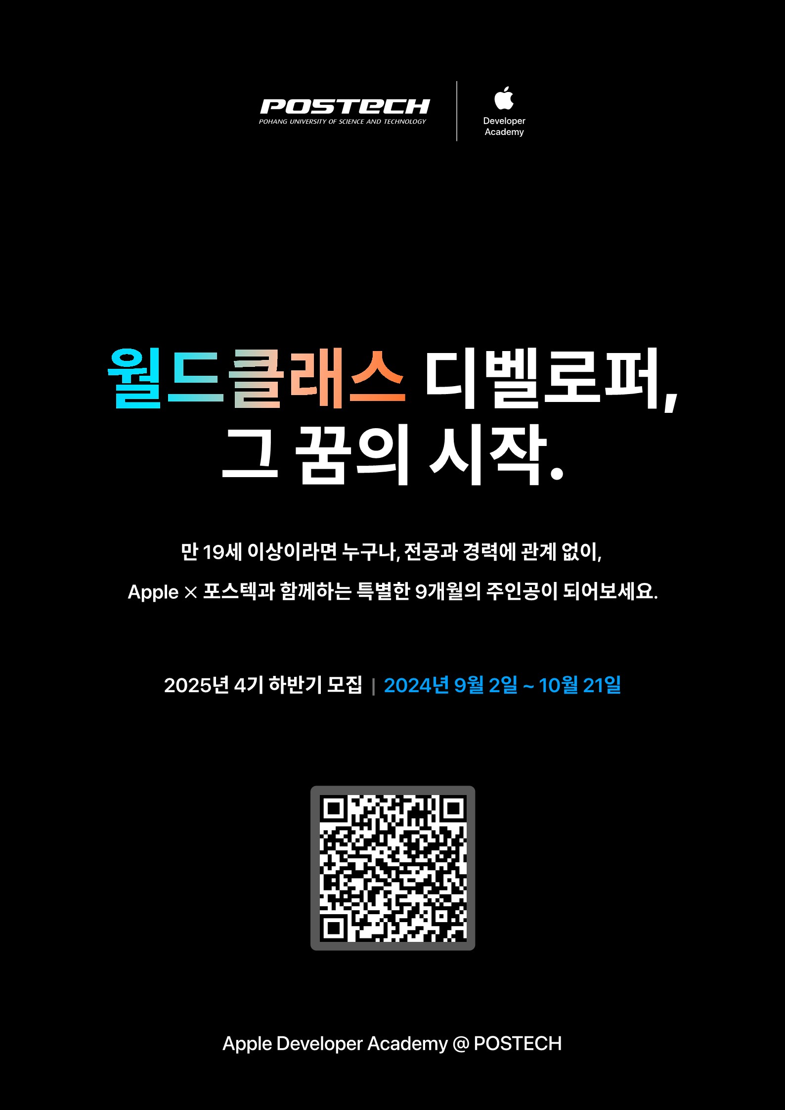 가. 지원 대상: 만 19세 이상 해외 여행 결격사유가 없는 분(연령, 전공, 학력/경력 무관) 나. 선발 인원: 총 200명 내외 다. 지원 분야: 테크, 디자인, 도메인(테크와 디자인을 제외한 모든 분야) 라. 교육 비용: 100% 전액 장학 제도 마. 교육 혜택: 매 월 학습지원장학금 세후 100만 원 지원 및 최신 Apple 장비 무료 대여 바. 교육 장소: 경상북도 포항시 남구 지곡로 80, 포항공과대학교(POSTECH) C5 사. 프로그램 기간: 2025년 3월 ~ 12월(9개월) 예정 3. 하반기 지원 일정 가. 지원서 접수 기간: 2024년 9월 2일 (월) ~ 10월 21일 (월) 낮 12시 나. 온라인 테스트: 2024년 10월 25일(금) ~ 10월 27일(일) 다. 온라인 인터뷰: 2024년 11월 11일(월) ~ 11월 15일(금) *상세 일정 개별 메일 안내 라. 최종 합격 발표일: 2024년 11월 22일 (금) 4. 지원 방법 가. 모집 포스터 내 QR 스캔 또는 홈페이지에서 지원 바로가기 클릭(developeracademy.postech.ac.kr/apply) 나.신규 계정 생성(*이메일 확인 필수) 또는 지원페이지 로그인 다. 지원페이지 접속 후 지원서 작성 클릭→기본 정보 및 지원 서류 업로드→제출 라. 지원 접수 마감 전까지는 지원서 수정 및 재제출 가능 라. 지원 관련 문의처: 공식 카카오 채널(bit.ly/2025ApplyNow) 5. 참고 사항 가. Apple 디벨로퍼 아카데미 소개 2022년 포항공과대학교에 설립된 Apple 디벨로퍼 아카데미는 9개월 동안 개발, 디자인, 기획, 마케팅, AI 등을 교육하여 "T형 인재"를 양성합니다. 매년 200여 명의 인재들이 앱 개발, 디자인, 창업 등 다양한 분야에서 활동하며 지역 사회에 기여하고 있습니다. 나. Apple 디벨로퍼 아카데미 공식 소셜 미디어 채널 1) 인스타그램: @appledeveloperacademy.postech 2) X: @devacad_postech 3) 카카오 채널: 포스텍 애플 디벨로퍼 아카데미 (bit.ly/2025ApplyNow) 3) 링크드인: linkedin.com/school/apple-developer-academy-postech 4) 블로그: blog.naver.com/developeracademy