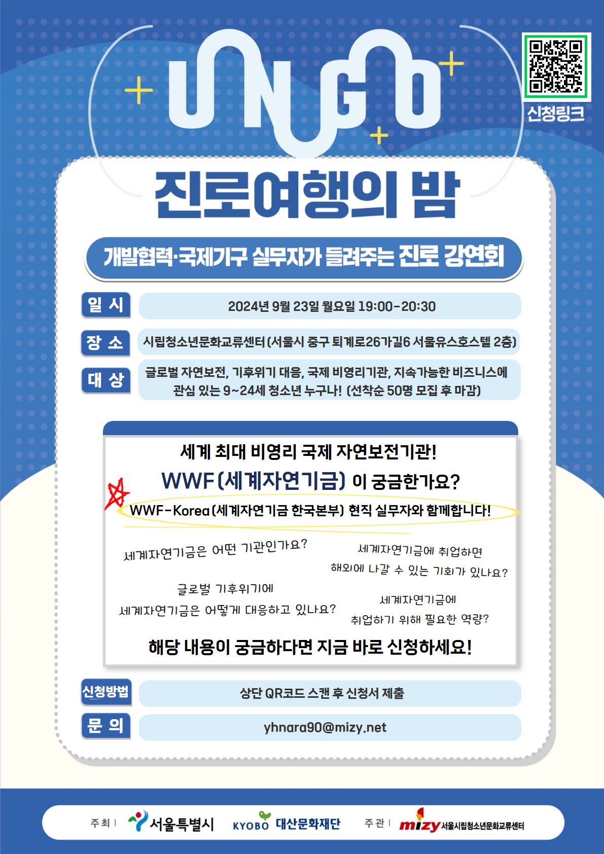 UNGO진로여행의밤(진로특강) WWF-KOREA(세계자연기금 한국본부)(9/23) 글의 상세내용