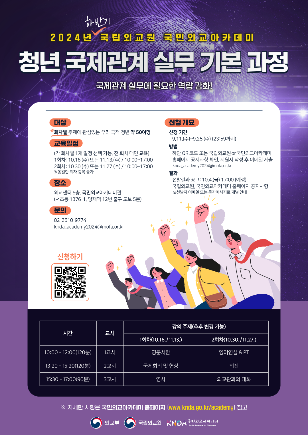 ㅇ 접수 일정 : 2024.9.11.(수)-9.25.(수) (23:59 마감) * 접수 현황에 따라 연장 가능 - 포스터 QR 코드를 통해 세부사항 확인 및 지원서 작성 ※ 국립외교원·국민외교아카데미·외교부 홈페이지 공지 안내 참조