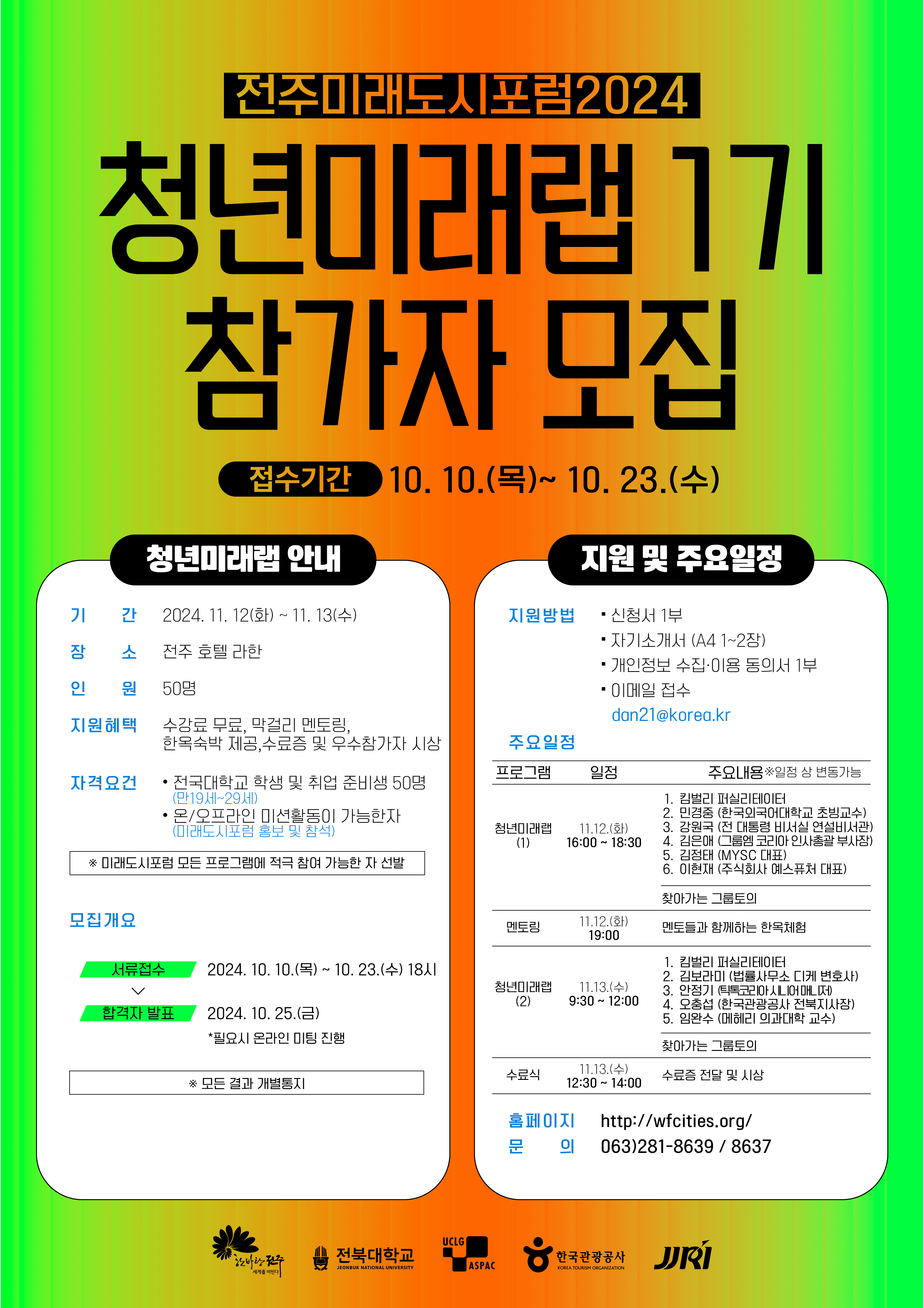 | 제목 | 전주미래도시포럼 2024 및 청년미래랩 참가자 모집 | ||||