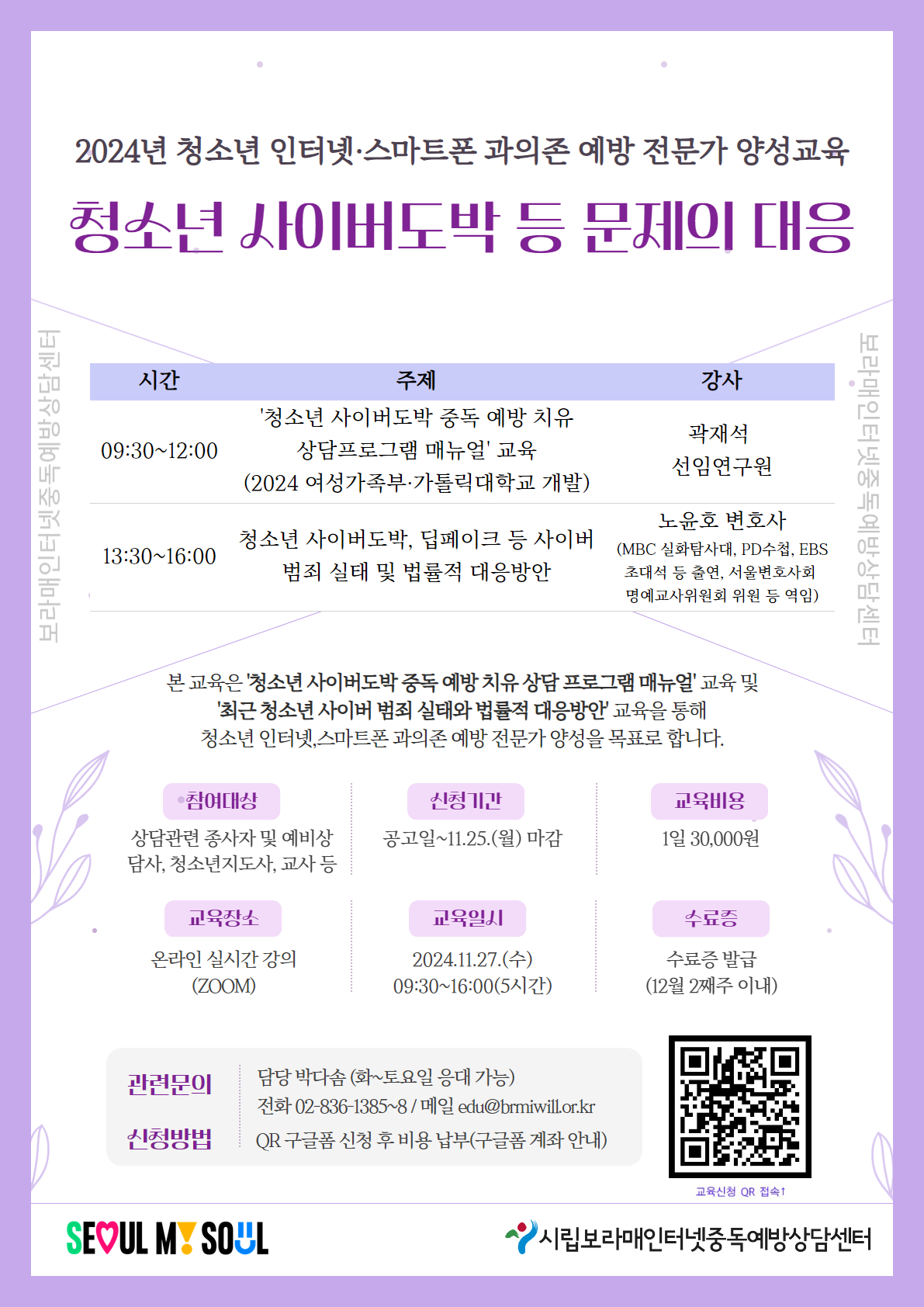 가. 신청일시: 2024. 11. 27.(수) 09:30~16:00 나. 모집기간: 2024. 11. 25.(월)까지 다. 신청방법: 온라인 신청(https://forms.gle/uh1kQ3ArFevxArxP8) 후 교육비 납부(선착순 마감) 라. 세부내용
