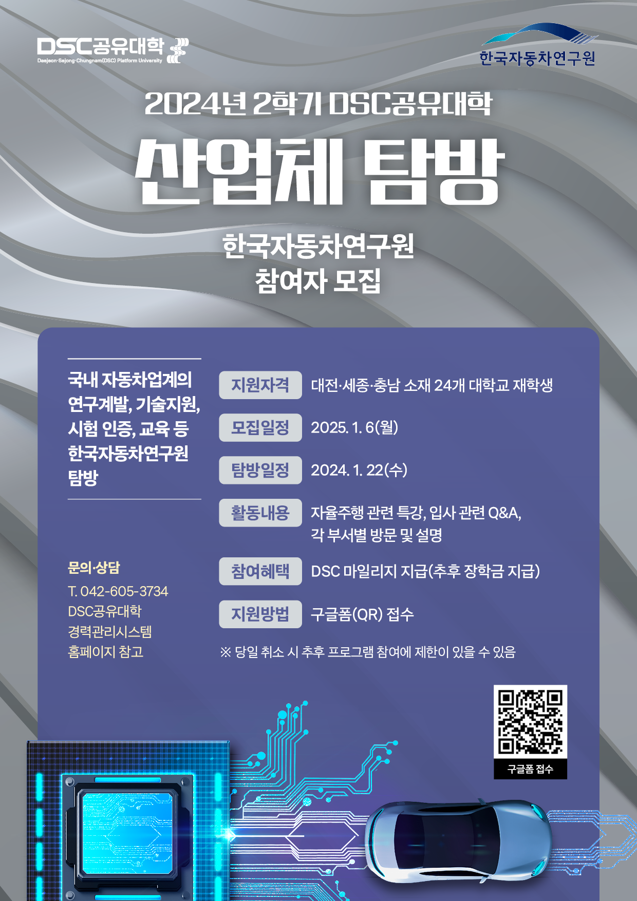 - 모집인원: DSC 공유대학 24개 참여대학 소속 재학생 20명(선착순) - 모집일정: ~ 2025. 1. 6.(월) 까지 ※ 선정발표는 2025. 1. 7.(화) 이후 - 탐방일정: 2025. 1. 22.(수) - 장 소: 한국자동차연구원(충남 천안시) - 참여혜택: 수료 시 DSC공유대학 마일리지 지급(추후 장학금 지급) - 참여방법: 설문지 링크 접속(https://forms.gle/SYJ1oxQ7VPagDzkJA)