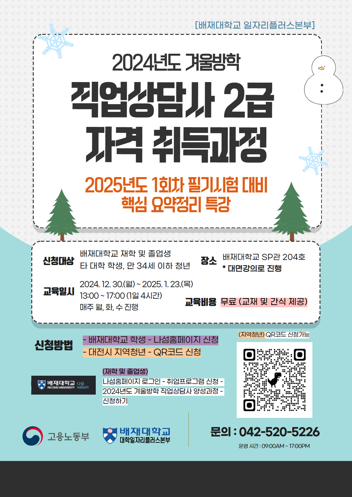 가. 프로그램명: 2024년도 겨울방학 직업상담사 2급 자격 취득과정 나. 모집기간: 2024. 12. 5.(목) ~ 12. 26.(목) 다. 교육신청: 구글폼 https://forms.gle/QJTMoc7fN2FApWL57 (포스터에 QR코드 참고) 라. 선발발표: 2024. 12. 27.(금) ※ 신청자는 유선 상담 필수 (모집 기간 중 개별 유선상담) 마. 교육기간: 2024. 12. 30.(월) ~ 2025. 1. 23.(목) 13:00~ 17:00(4H), 총 52시간 바. 운영장소: SP관 204호(배재대학교) 사. 모집인원: 30명 내외 아. 참여대상: 재학 및 졸업생, 지역청년 (타 대학교 재학생·졸업생) 자. 교육혜택: 교육 비용 무료(교재 무료 제공) 차. 담 당 자: 배재대학교 취·창업지원처 취업지원팀 변율선 컨설턴트(042-520-5226)