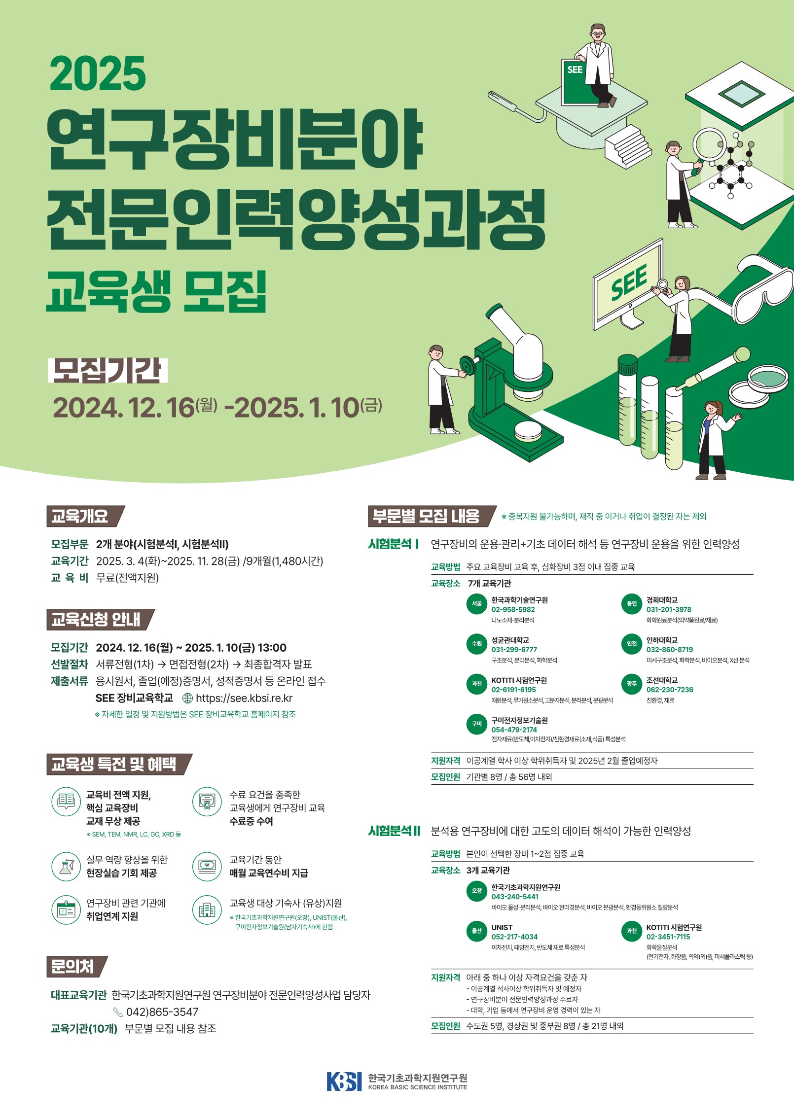 지원 자격 | 이공계열 학사이상 학위취득자 및 2025년 2월 졸업예정자 | 아래 중 하나 이상 자격요건을 갖춘 자 - 이공계열 석사이상 학위취득자 및 2025년 2월학위취득 예정자 - 연구장비분야 전문인력양성과정 수료자 - 대학, 기업 등에서 연구장비 운영 경력이 있는 자 |