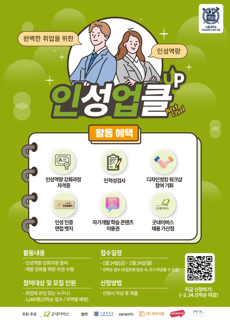가. 활 동 명 : 굿네이버스 미취업청년 인성역량 강화 자격증 과정 12기 참여자 모집 나. 참여대상 : 취업에 관심 있는 청년 누구나 다. 모집인원 : 1,000명(선착순 접수) 라. 접수일정 : 2025년 1월 24일(금) ~ 2월 24(월) 마. 활동내용 1) 인성역량 강화 과정 참여(온라인) 2) 인성역량 강화 미션 수행 등 바. 참여혜택 1) 인성역량 강화과정 자격증 제공 2) 인적성 검사 프로그램 제공 3) 디자인씽킹 워크샵 참여기회 제공 4) 인성 인증 면접 뱃지 제공 5) 자기개발 학습 콘텐츠 이용권 제공 6) 굿네이버스 채용 가산점 제공 사. 참여방법 : [첨부]교육안내서 확인 후 구글폼 신청서(구글폼 링크) 제출 신청서 링크 https://forms.office.com/r/6EG5zZPFr0