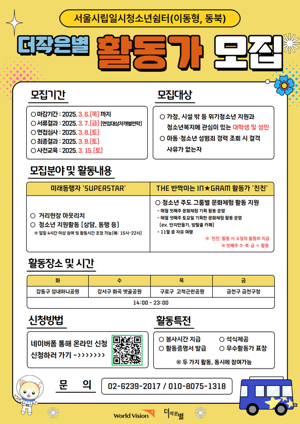 가. 지원자격 : 위기청소년 지원에 관심이 있는 대학생 및 관련 분야 전공자 (청소년·사회복지·교육학 등) 나. 모집기간 : 2025. 1. 24.(금) - 3. 6.(목) 까지 다. 모집인원 : 총 20명 라. 지원방법 : 홈페이지 및 인스타그램 게시된 네이버 폼 작성 후 제출 (신청링크 – https://naver.me/xv3wD6lH) 마. 선발과정 : (1차) 서류심사 (2차) 면접심사 바. 면접일시 : 2025. 3. 8.(토) / 개별통보 사. 활동기간 : 2025. 3.-12. (10개월) 아. 활동내용 : 이동쉼터 활동지 현장 아웃리치, 청소년 지원활동, 청소년 주도 그룹별 문화체험 활동지원 자. 활동혜택 : 활동에 따라 소정의 활동비 지급, 봉사시간 지급, 석식제공, 수료증 발급, 우수활동가 표창 등 차. 문 의 : 02-6239-2017