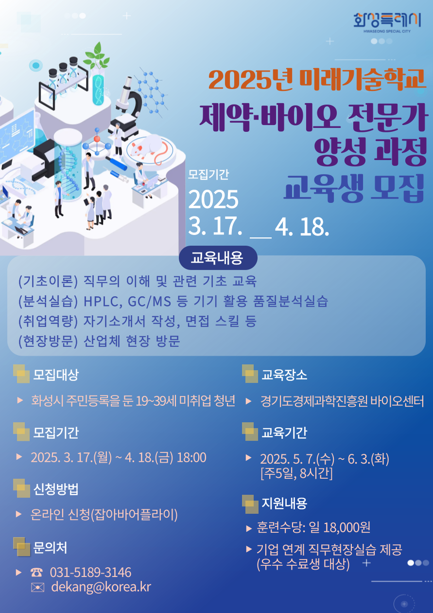 가. 모집기간: 2025. 3. 17.(월) ~ 4. 18.(금) 18:00까지 나. 모집대상: 화성시에 주민등록을 둔 19~39세 미취업 청년(20명) *재학·휴학생 제외 다. 신청방법: 온라인 신청(잡아바어플라이) 라. 교육기간: 2025. 5. 7.(수) ~ 6. 3.(화) [주5일, 5주] 마. 교육장소: 경기도경제과학진흥원 바이오센터 2층 에듀스테이션 사. 교육내용: 기초이론, 품질분석실습, 취업역량 교육 및 산업체 현장 방문 아. 지원내용: 훈련수당(일18천원) 및 기업 연계 직무현장실습(우수 수료생 대상) 자. 문 의 처: 화성시 청년청소년정책과(031-5189-3146)