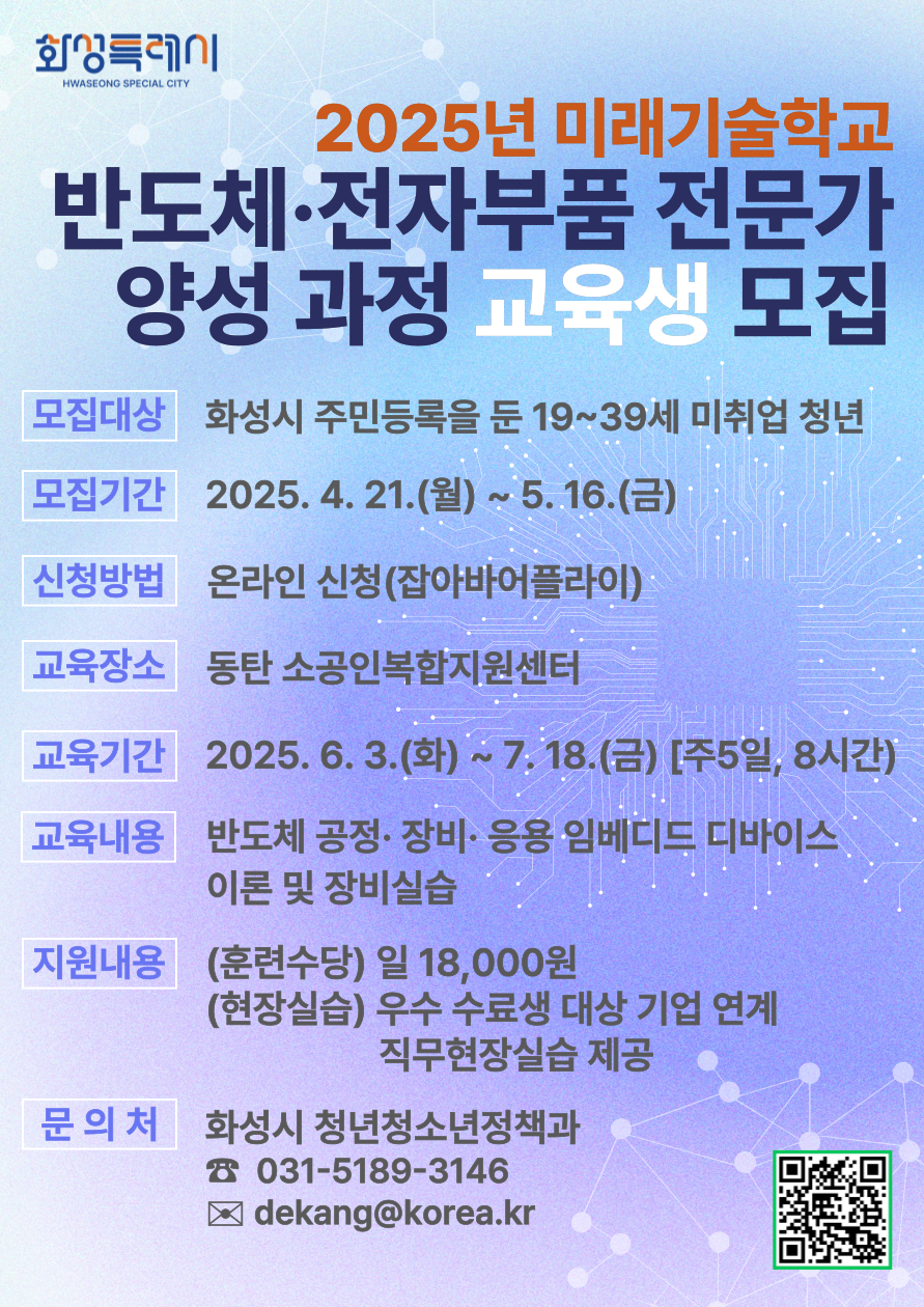 ○ 모집기간: 2025. 4. 21.(월) ~ 5. 16.(금) 18:00까지 ○ 모집대상: 화성시에 주민등록을 둔 19~39세 미취업 청년(20명) *재학·휴학생 제외 ○ 신청방법: 온라인 신청(잡아바어플라이) ○ 교육기간: 2025. 6. 3.(화) ~ 7. 18.(금) [주5일, 33회] ○ 교육장소: 동탄 소공인복합지원센터 2층 강의실(동탄첨단산업1로 57) ○ 교육내용: 반도체 공정·장비·응용 임베디드 디바이스 이론 및 실습 교육 ○ 지원내용: 훈련수당(일18천원) 및 기업 연계 직무현장실습(우수 수료생 대상) *직무현장실습 예정 기업: ㈜엠에이케이, ㈜유에스티, ㈜티티에스, 피에스케이(주) ○ 문 의 처: 화성시 청년청소년정책과(031-5189-3146)